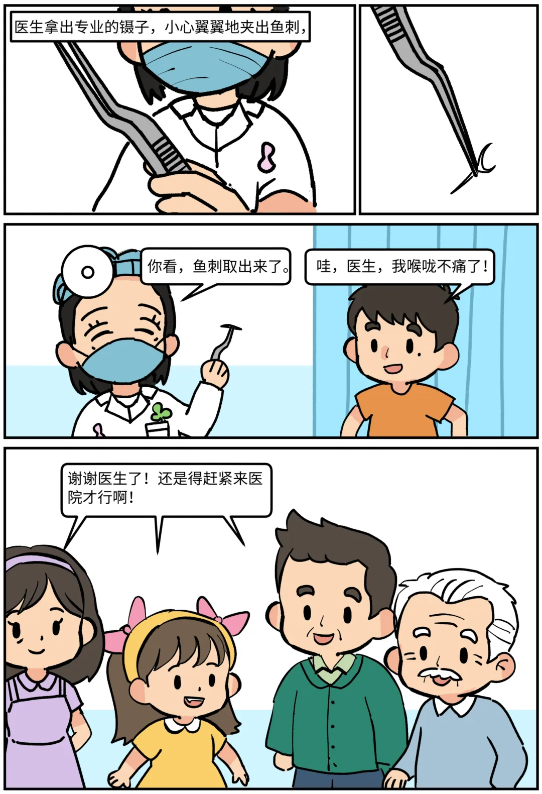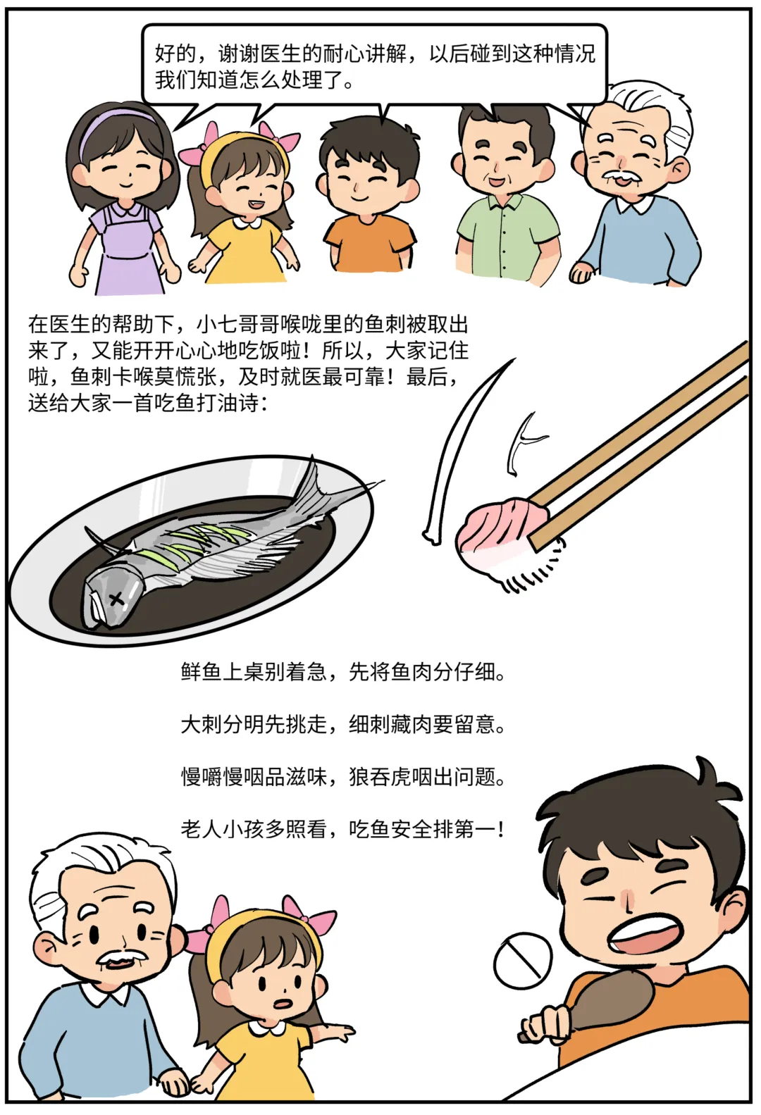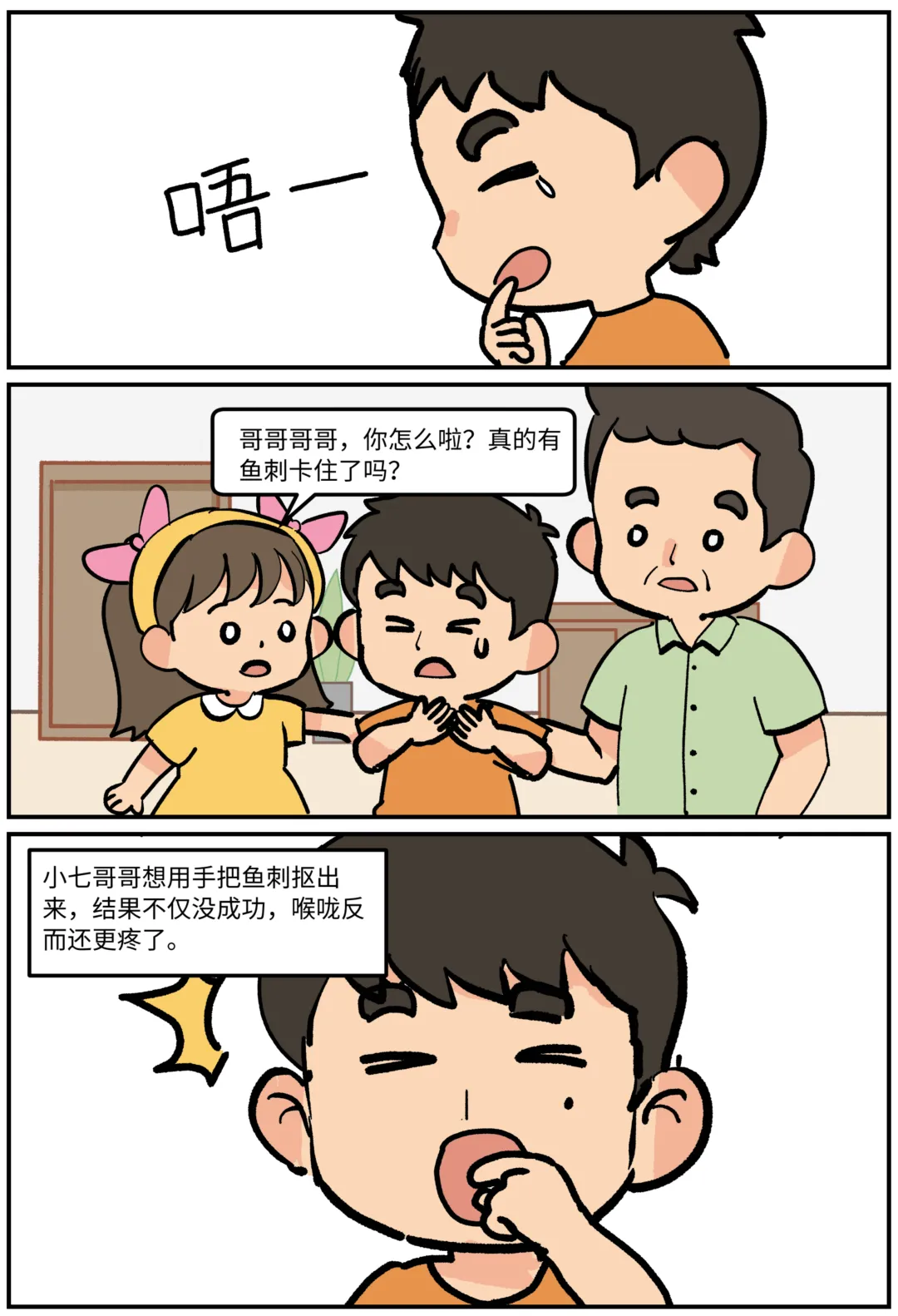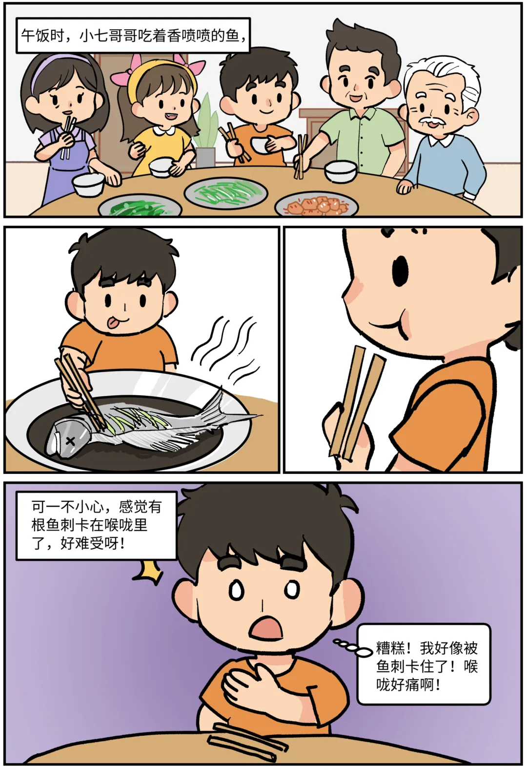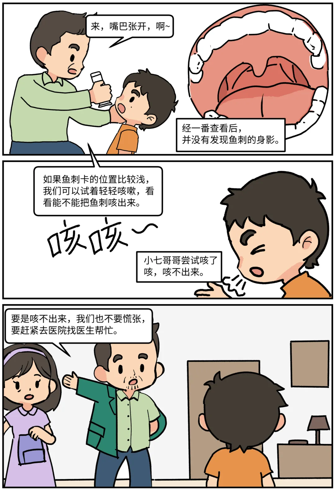 鱼刺卡喉怎么办?科普漫画《刺客大作战》 鱼刺卡喉,第一反应是喝醋还是吞饭?其实这些都不对!当吃鱼被卡住,这些习以为常的“土方法”可能正在帮倒忙!看图就能秒懂:哪些做法是雷区❌,怎样做才安全✅。生动有趣,一看就会! 作者:许满、庞宇峰 绘画:李仲陶