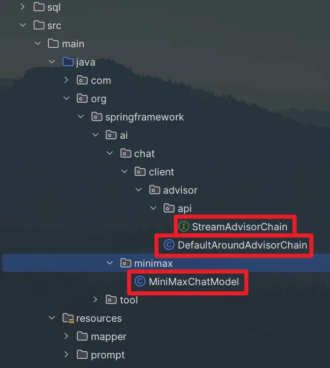 我们需要在自己的项目目录创建一个 org.springframework.ai.minimax.MiniMaxChatModel 具体文件内容可以访问 https://www.codecopy.cn/post/7lonmm[4] 获取完整的代码。详细代码位置如下图所示: