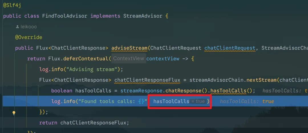 @Slf4jpublicclassFindToolAdvisorimplementsStreamAdvisor {@Overridepublic Flux<ChatClientResponse> adviseStream(ChatClientRequest chatClientRequest, StreamAdvisorChain streamAdvisorChain) {return Flux.deferContextual(contextView -> { log.info("Advising stream");return streamAdvisorChain.nextStream(chatClientRequest).doOnNext(streamResponse -> {booleanhasToolCalls= streamResponse.chatResponse().hasToolCalls(); log.info("Found tool calls: {}", hasToolCalls); }); }); }@Overridepublic String getName() { return"FindToolAdvisor"; }@OverridepublicintgetOrder() { return0; }}
