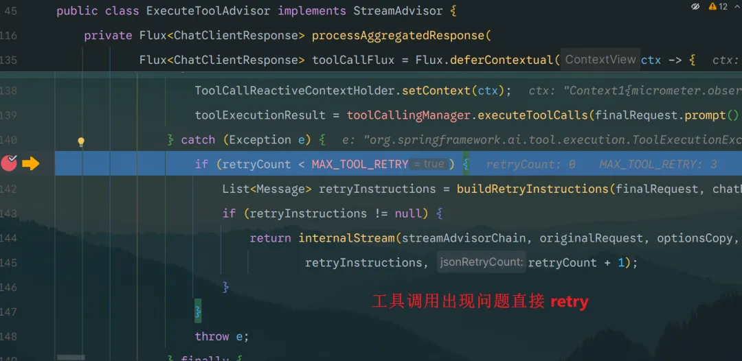 通过阅读源码 org.springframework.ai.minimax.MiniMaxChatModel#stream 可以发现,框架内部会在 ChatModel 层直接执行 Tool 调用,而不是将其透传给 Advisor 链。核心执行逻辑如下:
