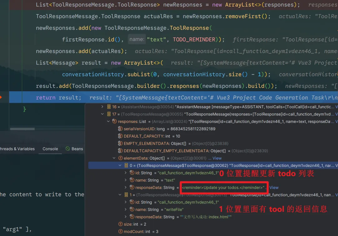todoUpdate时,在ToolResponseMessage的第一个位置注入提醒,引导 AI 及时更新任务列表。