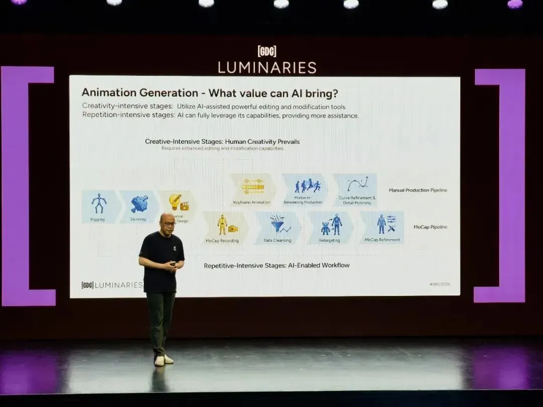 腾讯在动画生产里同样区分了创造性阶段和重复性阶段。前者包括动画概念设计、关键帧动画;后者则包括骨骼生成、蒙皮、帧插值等大量繁琐工作。