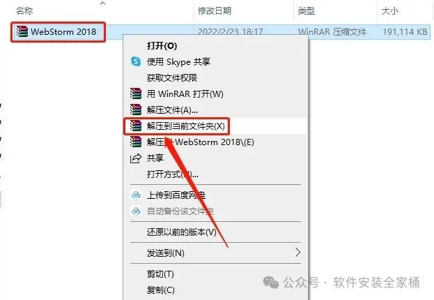 1、下载WebStorm 2018软件安装包到电脑上,右键选择【解压到当前文件夹】。