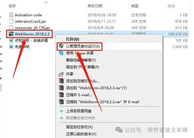 3、找到【WebStorm-2018.2.3】应用程序,右键选择【以管理员身份运行】它
