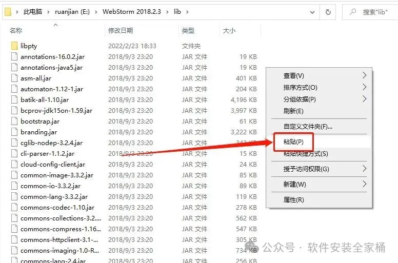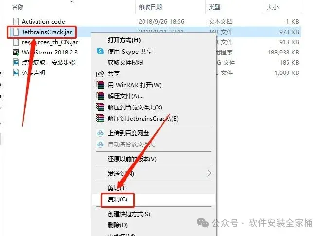 12、回到WebStorm 2018文件夹,找到【JetbrainsCrack】文件,再右键点击【复制按钮】