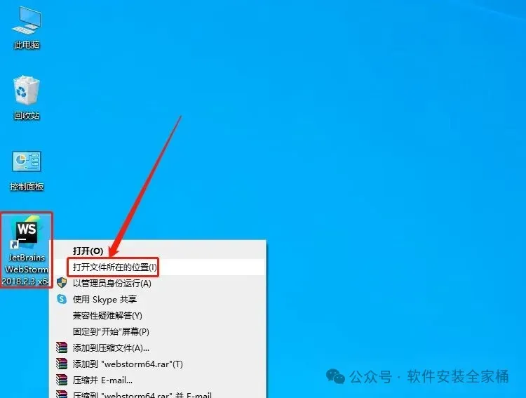 16、回到桌面,右键桌面上的【WebStorm 2018.3软件图标】,点击【打开文件所在的位置】
