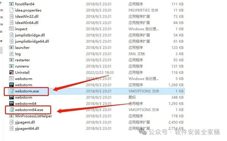 17、找到并选中【webstorm.exe】和【webstorm64.exe】,再依次点击【打开方式】、【记事本】。