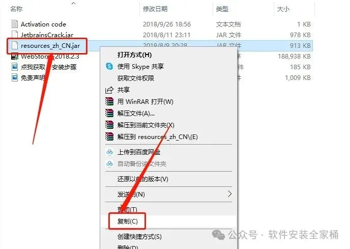 20、回到WebStorm 2018文件夹,找到【resources_zh_CN.jar】文件,再右键点击【复制按钮】
