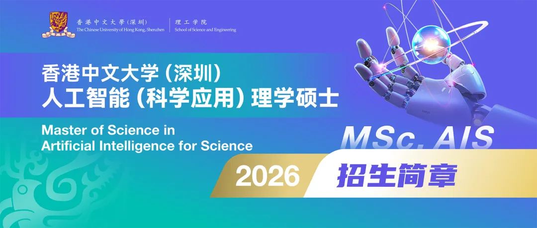 香港中文大学(深圳)理工学院人工智能(科学应用)理学硕士项目 (MSc. AIS) 是围绕人工智能与前沿自然科学及工程的交叉领域开设的为期两年的全日制硕士项目,旨在培养兼具人工智能技能与相关科学素养的跨学科复合型创新人才。项目课程涵盖人工智能、数学、物理、化学、材料、新能源与工程、机器人等多个学科知识,突出跨学科融合,并以前沿科研为驱动。学生将系统学习人工智能核心方法,包括机器学习、深度学习、生成式模型以及科学计算,并通过跨学科以及实际科研项目深入接触和理解其在前沿科学问题中的应用。
