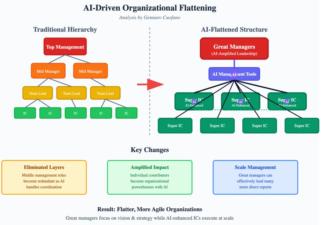 不仅是软件,公司和组织的中间层也在消亡。传统的金字塔式管理结构中,许多中层管理者的主要职责是信息的传递和任务的分解。