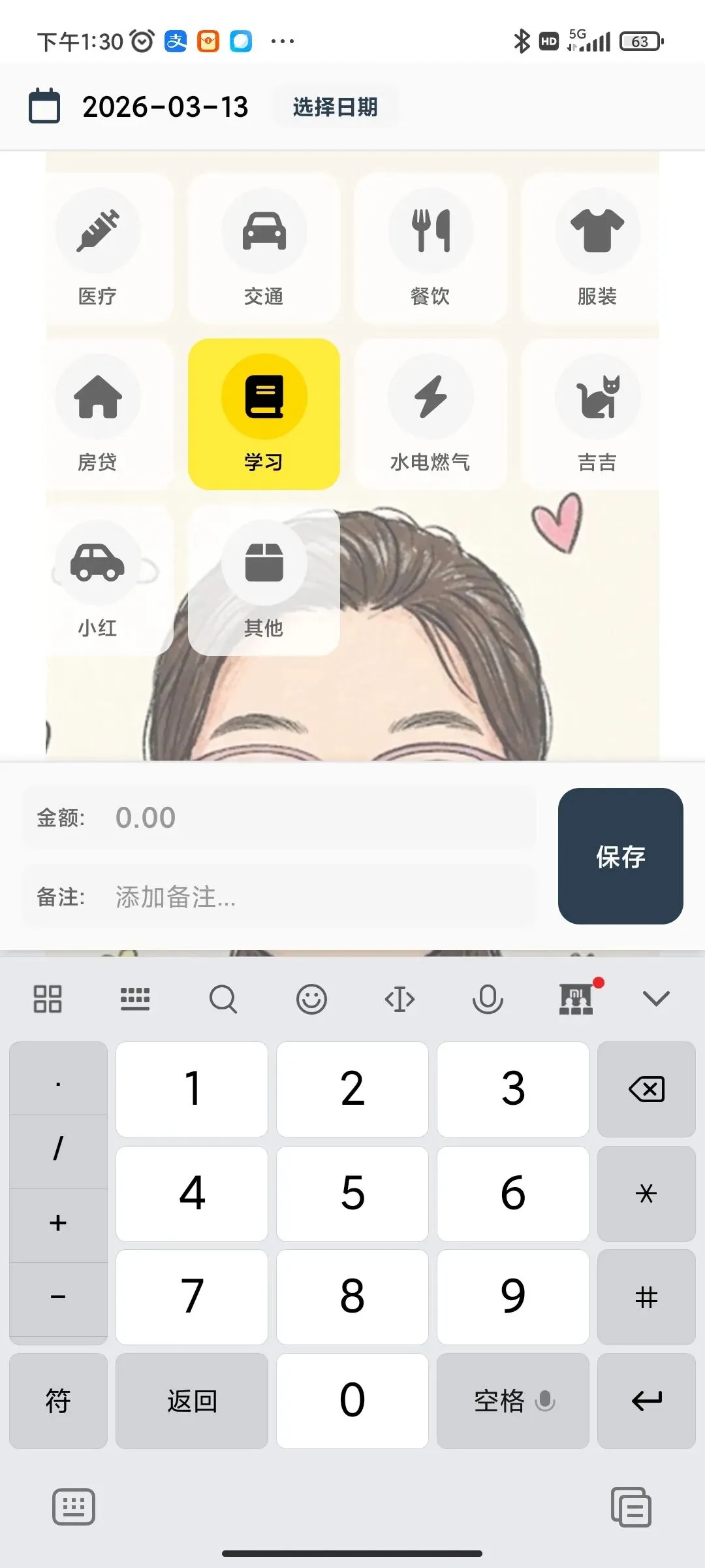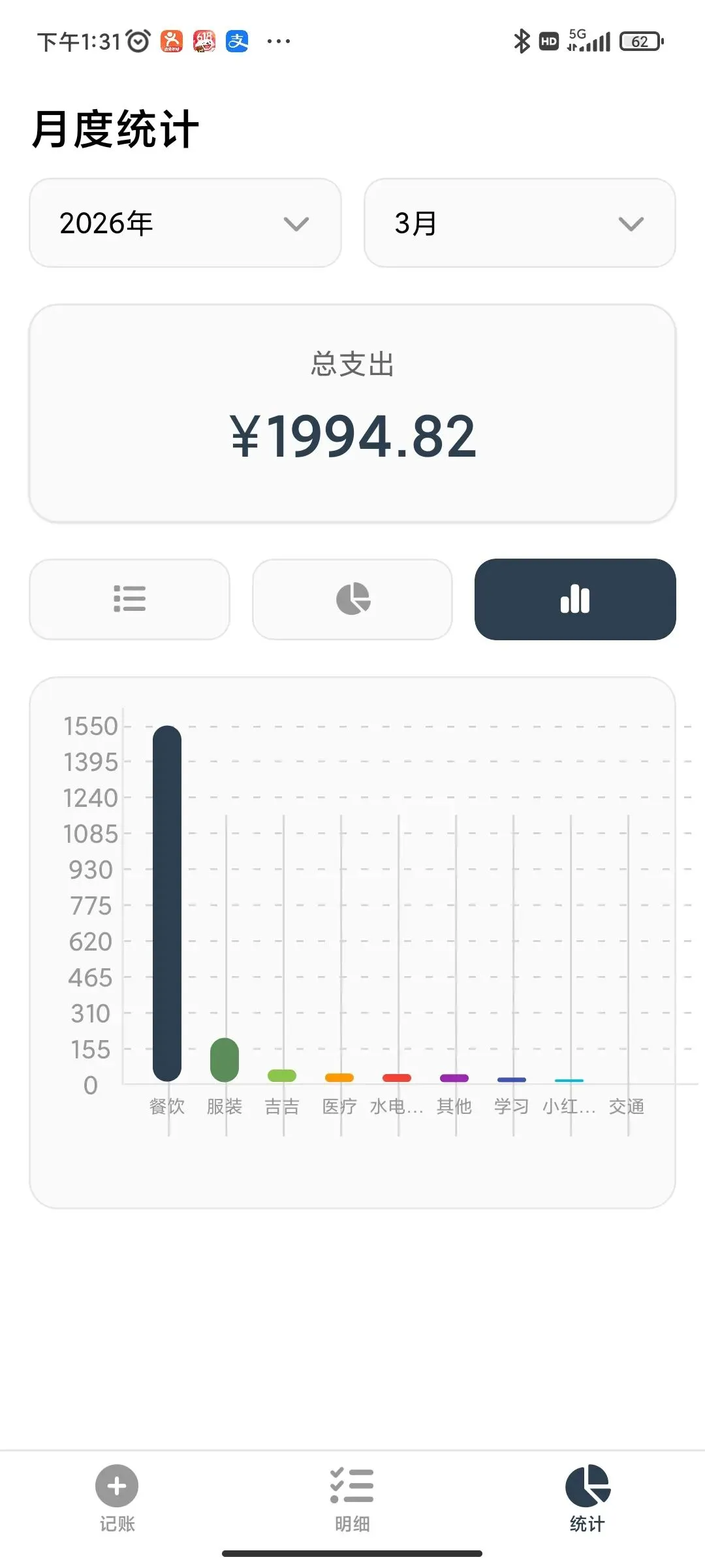 ●支出分类(按我家情况定制):交通、餐饮、服装、房贷、小红(我家车)、学习、医疗、吉吉(我家猫)。