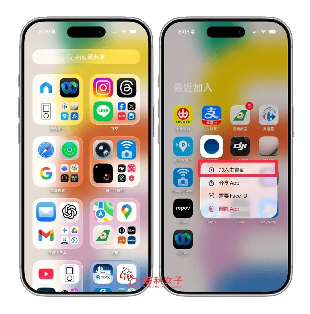 第二个方法,你也可以直接滑到iPhone 最右边的「App 资料库」页面,在不同类别中找到该App 之后,长按该App 图示,接着,在跳出来的选单中点选「加入主画面」,然后该App 一样就会重新加入回iPhone 桌面了!