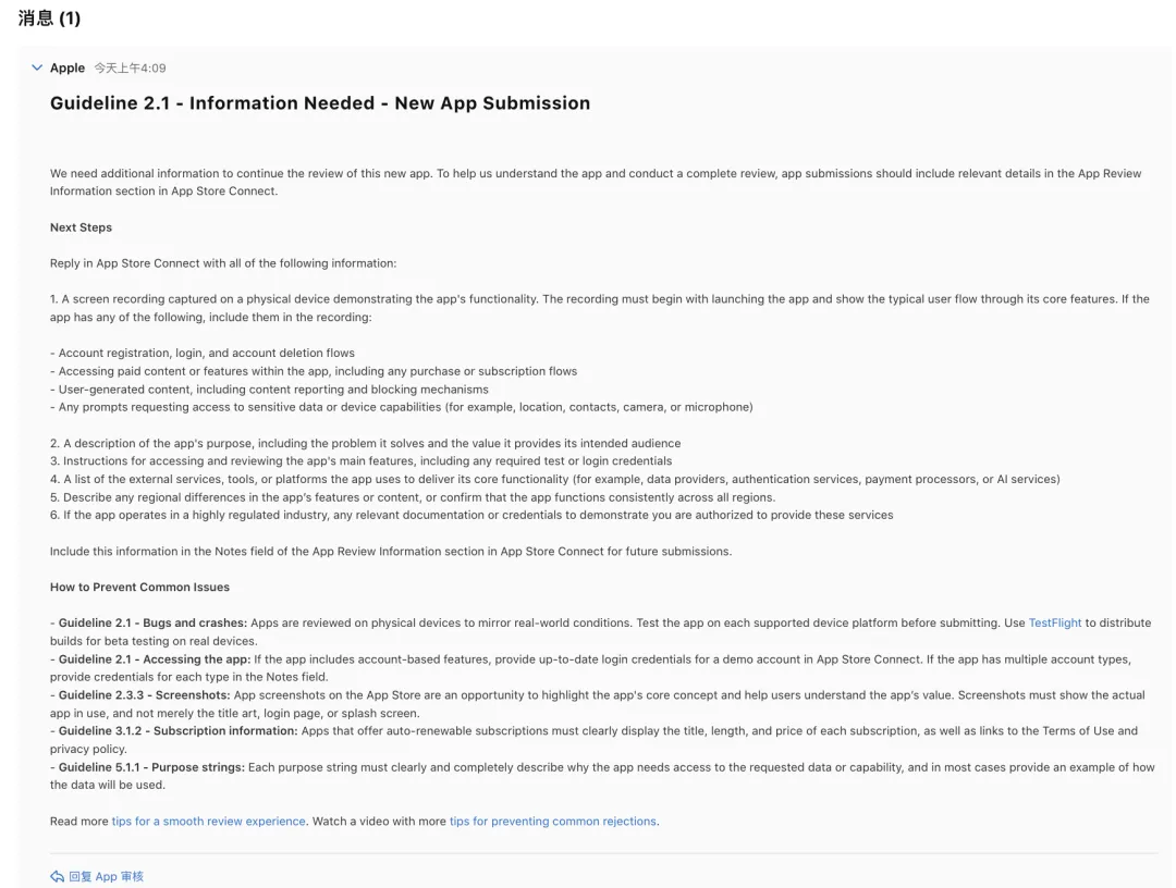 上周六,才恢复了积极的、勤快的、怀疑念头少少的生活节奏。比如前几天才终于认真地研究和草拟了App的隐私政策和用户协议。过年前,App的推进其实已经到这一步,但是自己一直在拖延。每每运行测试自己的App,总陷入无休止的细节优化。这也不是坏事。不过事情需要一个小小的“里程碑”来标记下当前“循环”的终点,进入下一层螺旋式的循环。比如:提交审核,上线。再继续完善优化。昨天在App Store Connect里第一次提审了我的App!第一次见识到了提审流程!🆒今天登录App Store Connect后,发现有了审核结果:未通过!问题待解决!^ ^,有问题反馈,就是好迹象。当我不去长时间地专注在自己的独立开发、一人公司事业上时,我的脑子不可避免地会有消极和自我怀疑的念头出现。但是紧跟着这些怀疑念头之后的是一种坚信:困难一定会迈过去的,只要认真花时间、动脑子、专注,还有依靠一些顺其自然、柳暗花明的灵感。我会解决这条路上遇到的所有问题Y(^_^)Y。每一个问题和困难终将迎来解决方案。有条有理地解决在这条路上遇到的问题,能够给我的内心带来满足和幸福。让我感觉到活着是一件幸福、知足而又有限的事情。人生有限,所以更加需要坚定地走上自己想要的路。而目前我能够安定地走在这条路上,也离不开我的命盘基础配置的支持。感恩,人、事、物。