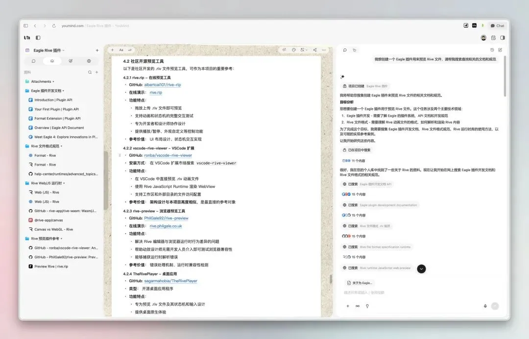 AI 给了我很多相关文档,还检索到了相关的开源项目。这一步特别关键——它帮我省去了大量搜索和筛选的时间。