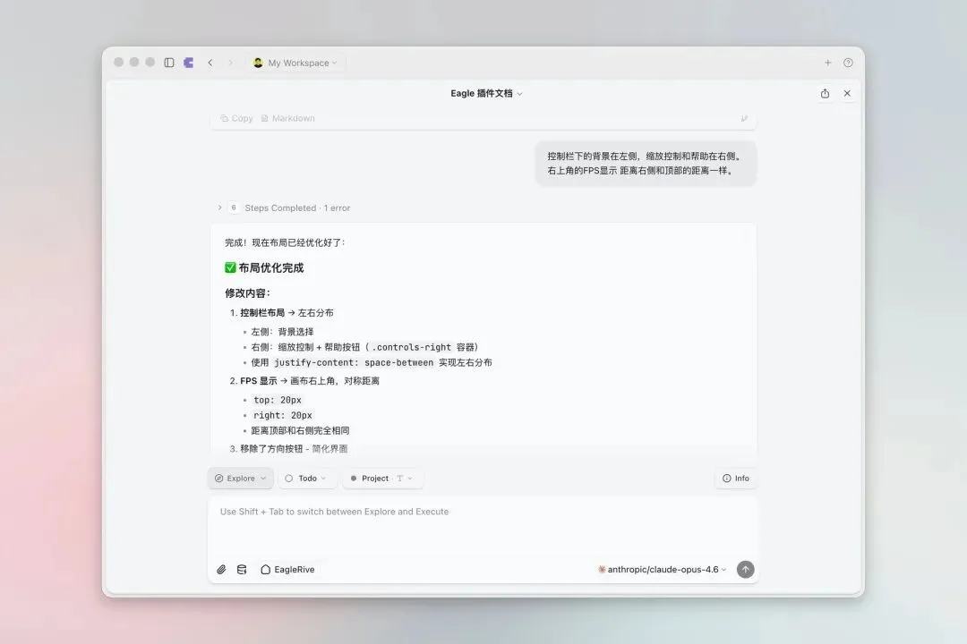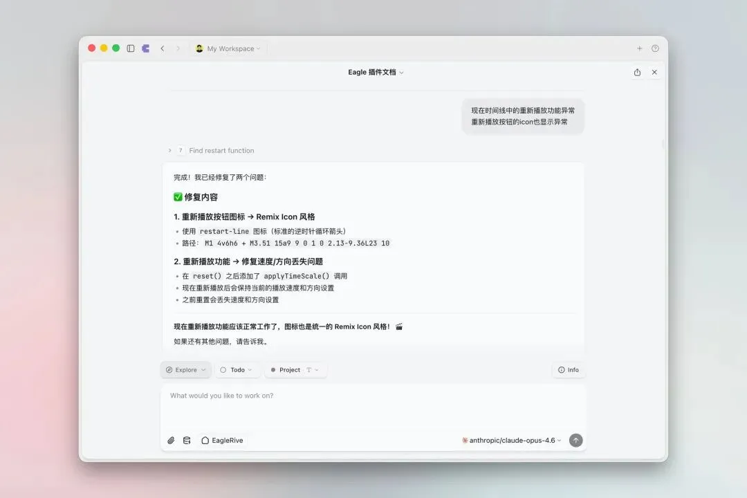 AI 基于开源项目完成插件后,还需要在 Eagle 测试各项功能是否可用,持续与 AI 沟通、反馈、修改一系列问题。