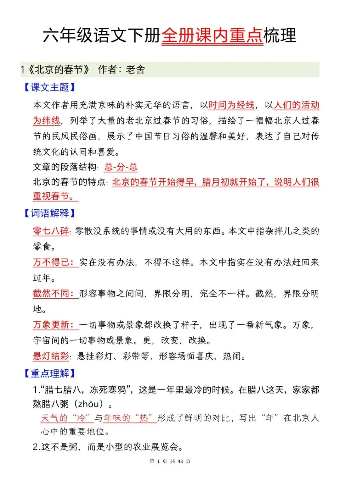 🌈今日分享26春人教部编版六年级下册语文《全册课内重点梳理》,共43页,电子版可打印。需要的家长抓紧打印出来,让孩子在每天练一练吧。