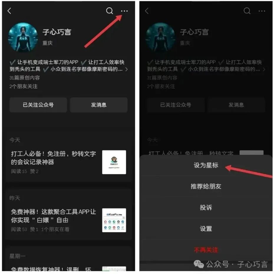 小伙伴们注意:获取神器请发文章结尾对应的关键词获取,子心每天不定时推送;但因信息流乱序,不少人还是错过了干货!子心建议大家把本公众号置顶(设为星标),以便第一时间看到推送,方法如下图: