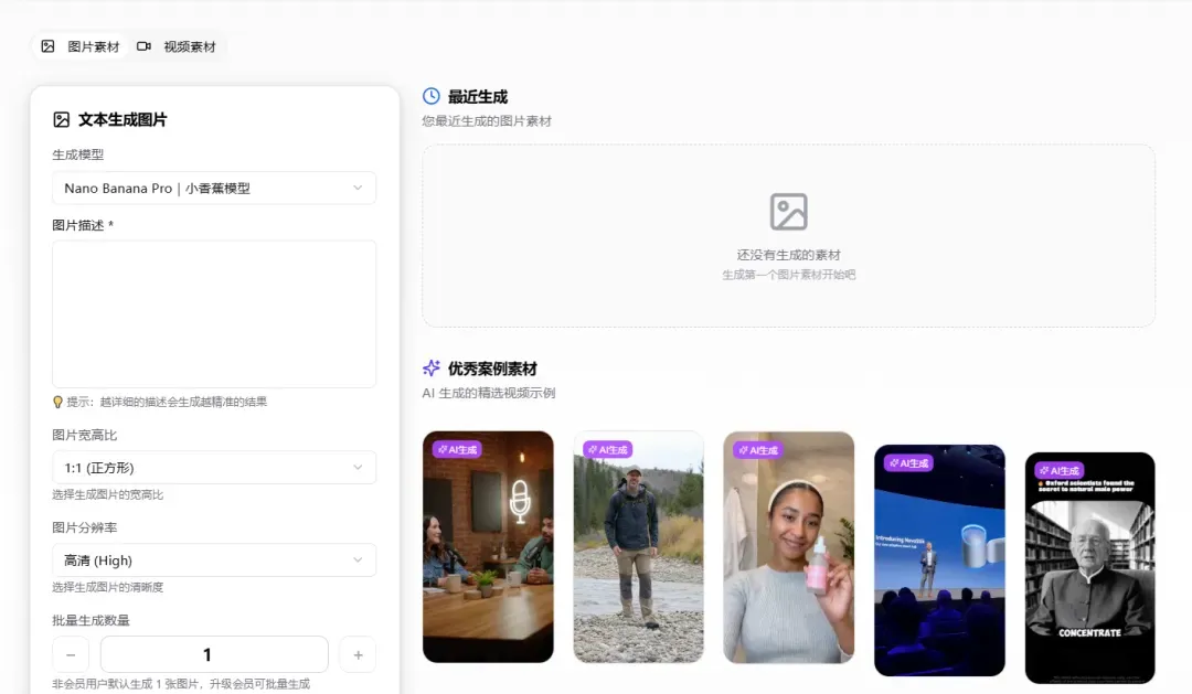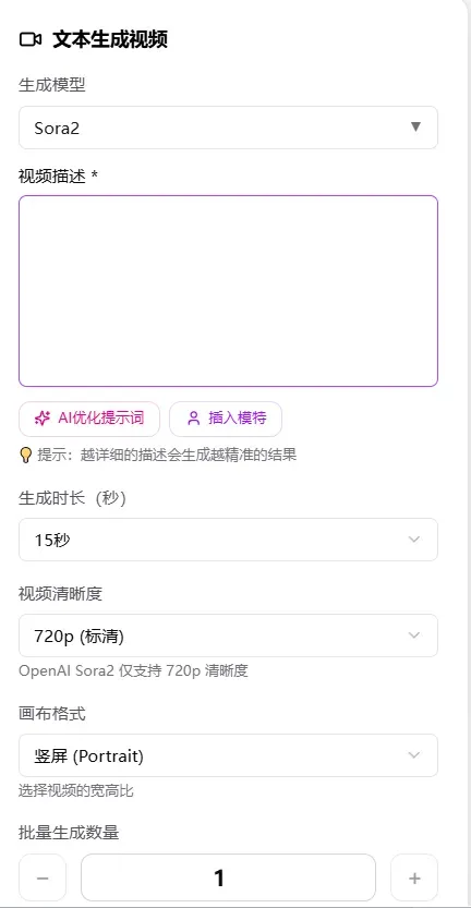 操作非常简单,打开素材制作,选择视频制作,选择生成模型,添加视频描述,如果说你觉得描述的不好,还可以一键AI优化提示词,帮我们丰富生成场景,然后我们选择生成时长、清晰度和视频比例,更惊喜的是,他还可以选择批量生成,最多可以直接一次生成20条视频,直接把效率拉满!