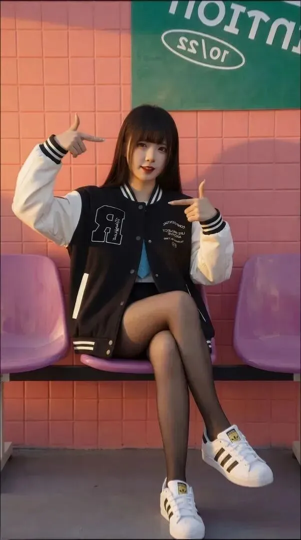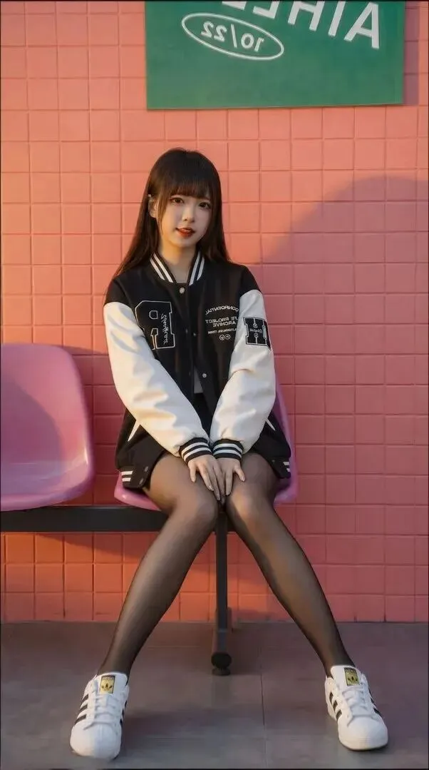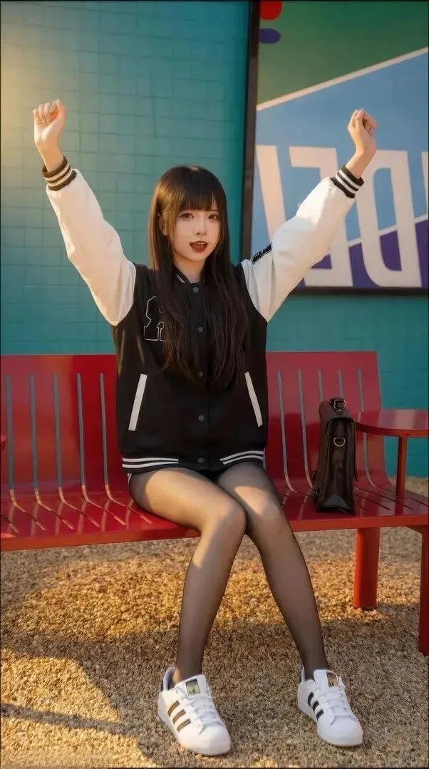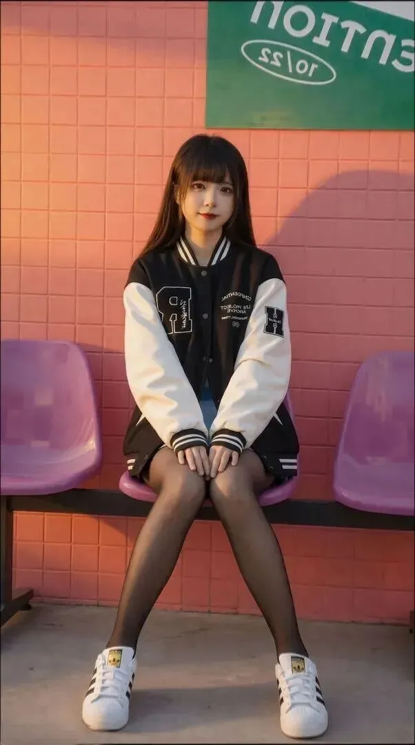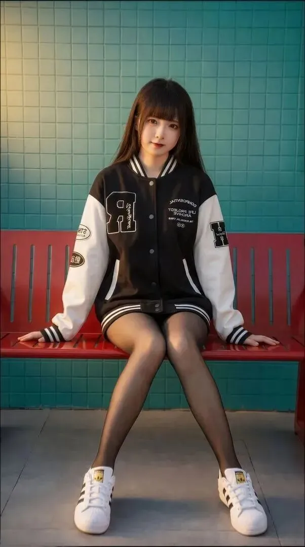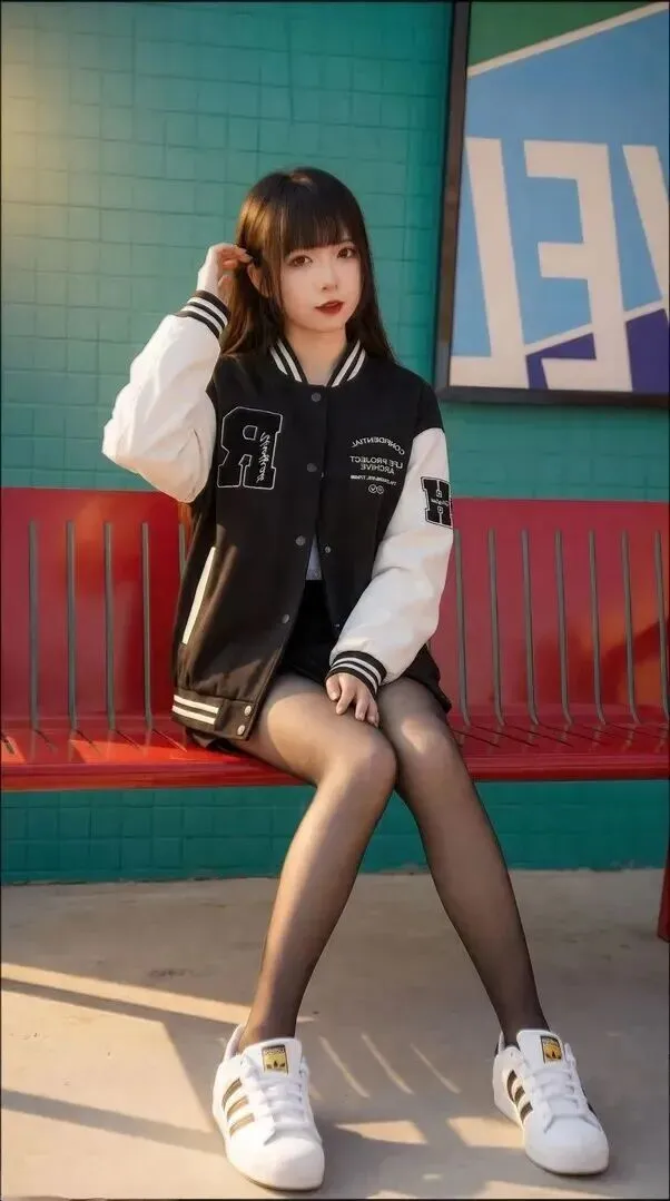 最后看全身效果。棒球服稍微敞开一些,露出内搭,裙袜比例正好。小个子身长一米八的气势。