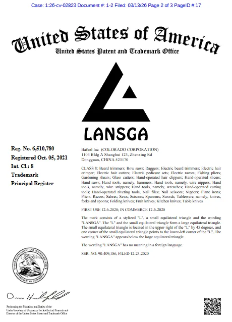 「案件追踪」 LANSGA 园艺工具品牌 26-cv-02823.