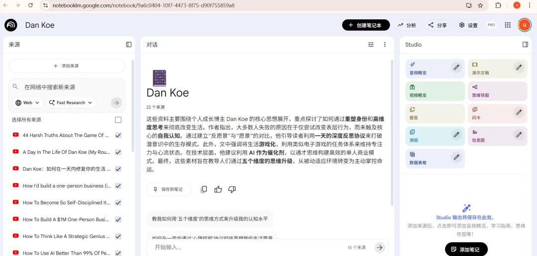 我用了 3 分钟,把 Youtube 上‘一人公司’教父 Dan Koe 的整个大脑,装进了我的 NotebookLM。