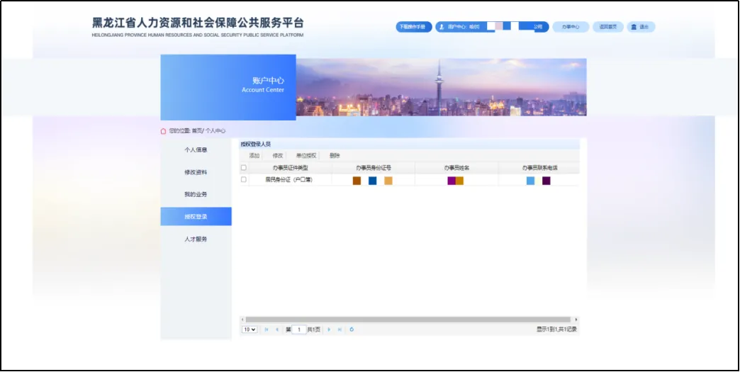(4)授权办事员:申请授权办事员登录系统操作本单位业务的,法人登录后,点击右上角“用户中心”,再点击“授权登录”项进入授权经办人操作界面。