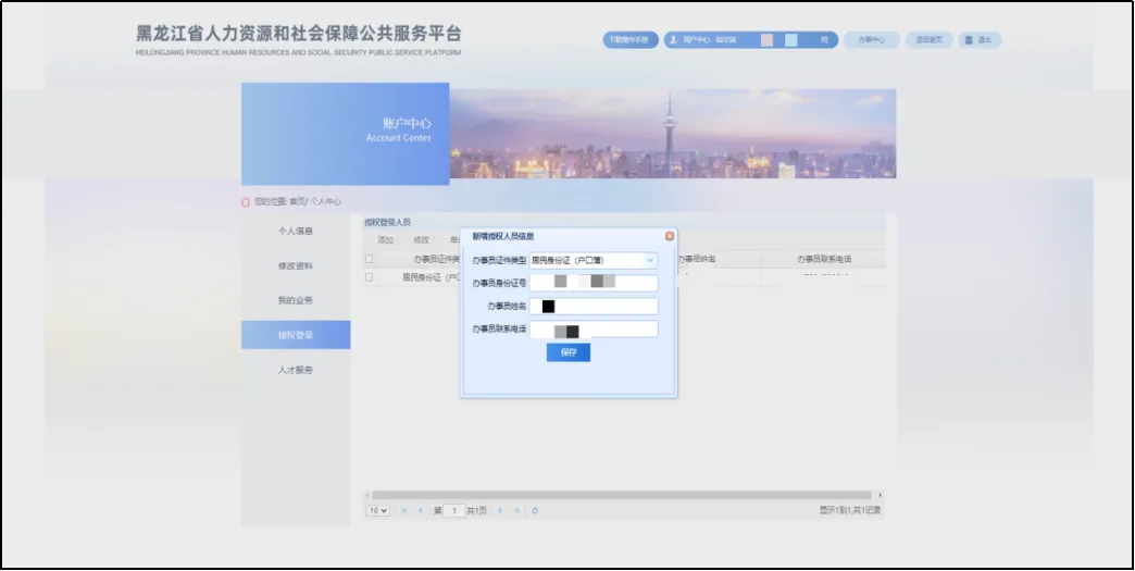 点击“添加”按钮,输入经办人证件号、姓名及联系电话后保存。