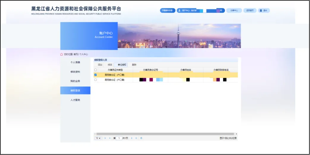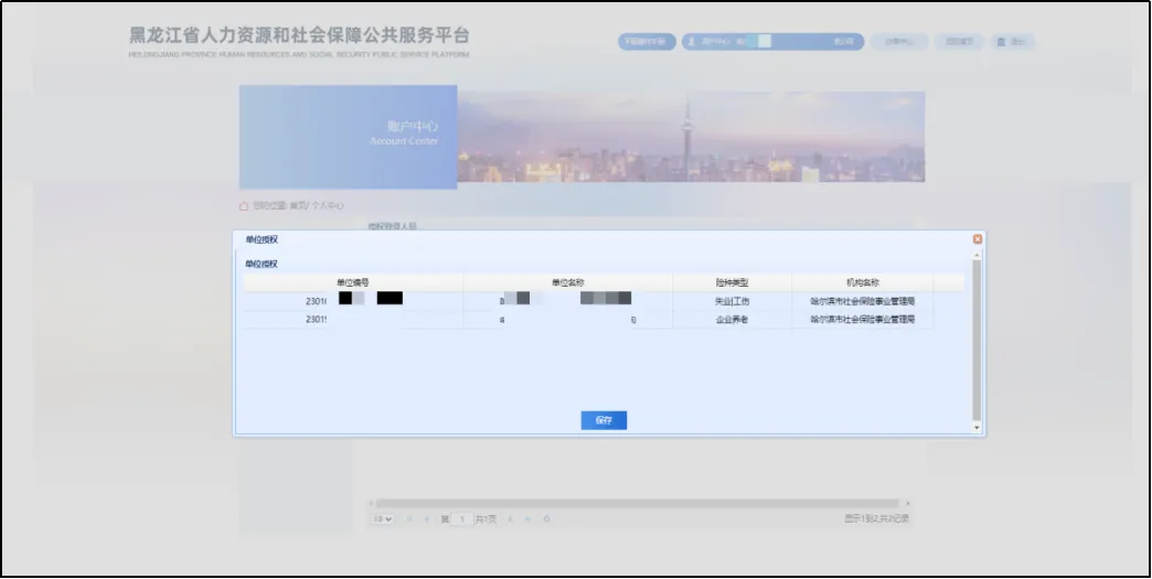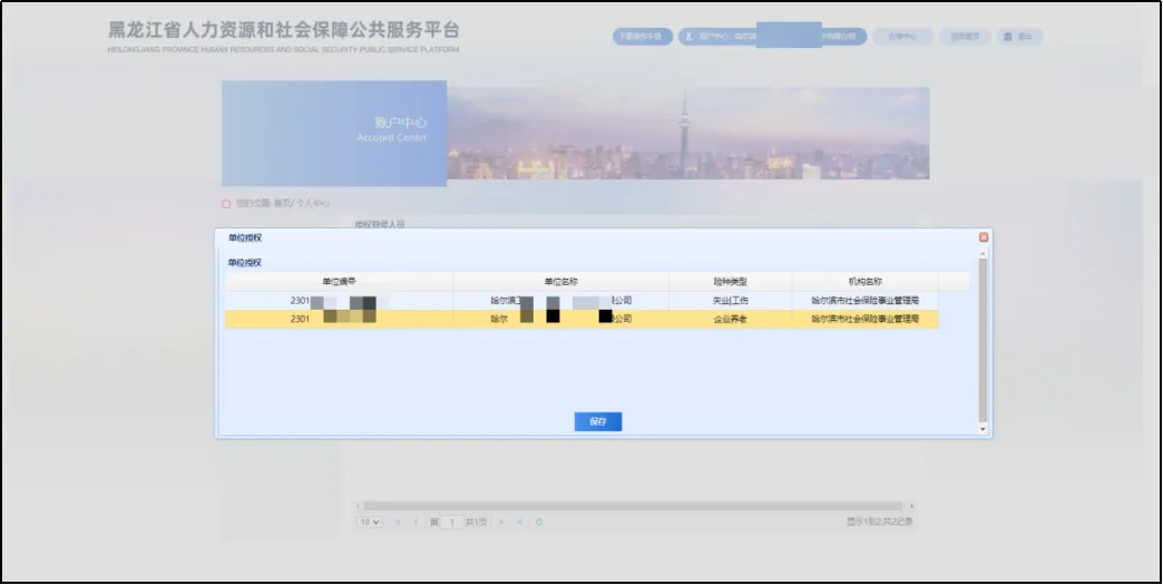 选中经办人,点击“单位授权”按钮。若单位存在多条参保关系,则弹出该企业所有参保信息。法人可选中信息中的一条或多条授权给该经办人。