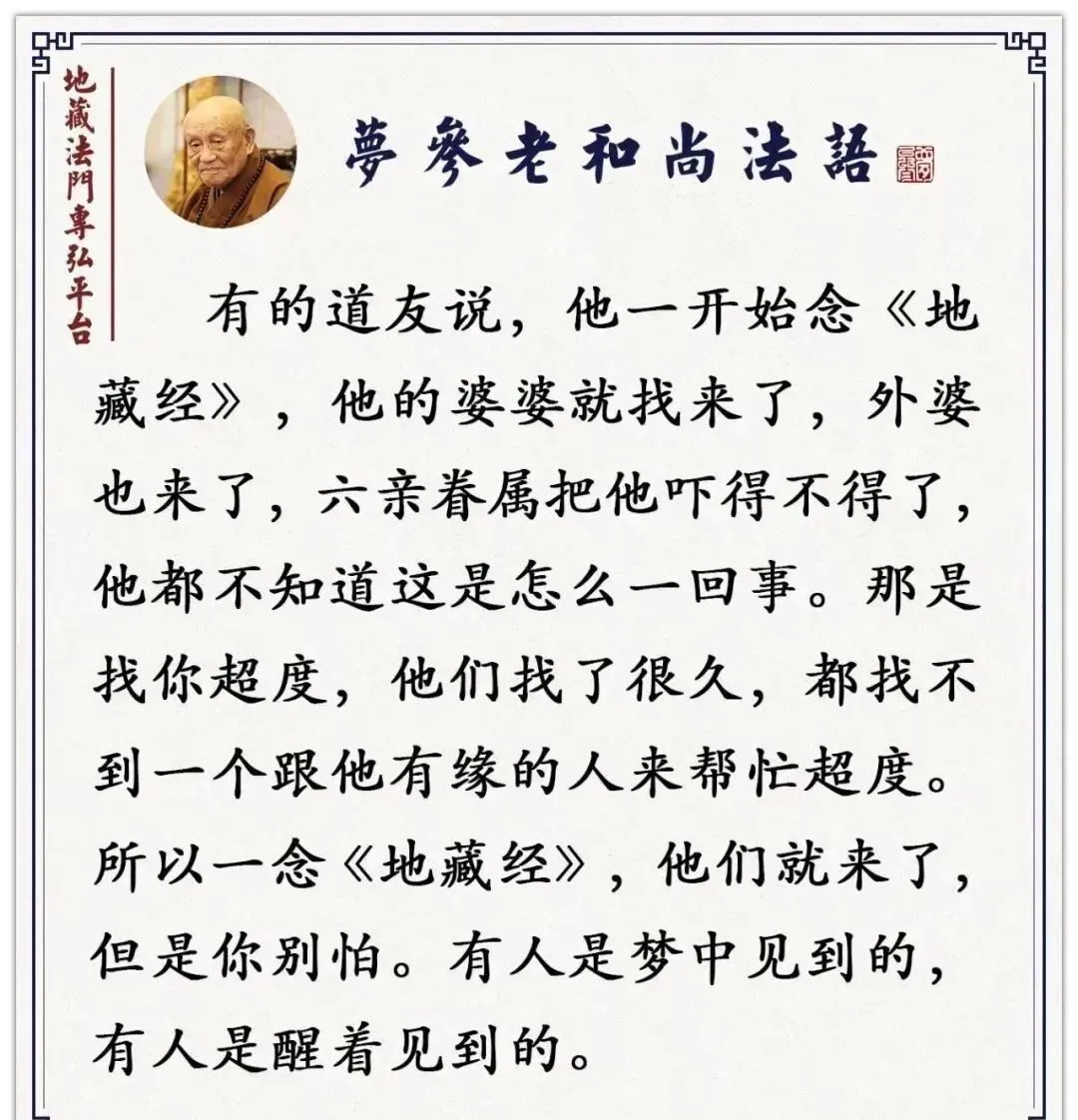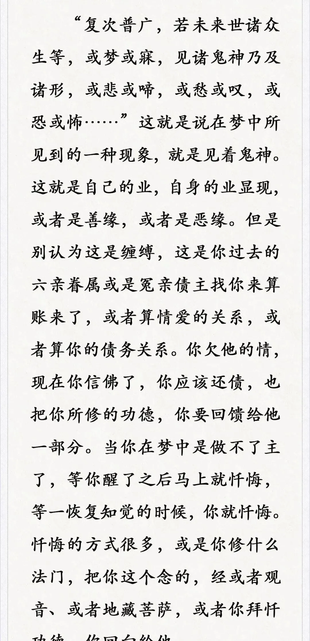 【复次普广。若未来世。诸众生等。或梦或寐。见诸鬼神。乃及诸形。或悲或啼。或愁或叹。或恐或怖。此皆是一生十生。百生千生。过去父母。男女弟妹。夫妻眷属。在于恶趣。未得出离。无处希望福力救拔。