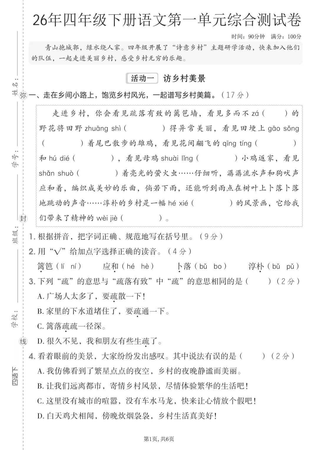 人教版四年级下册语文第一单元测试卷,共5套有答案,电子版可打印可下载,这份四下语文第一单元检测卷,包含了看拼音写词语、选词填空、句子仿写、阅读理解、写作等第一单元内的重要知识点,让孩子检验下近期的学习情况,及时查漏补缺,提高学习效率。有需要的家长抓紧打印出来给孩子练一练吧!