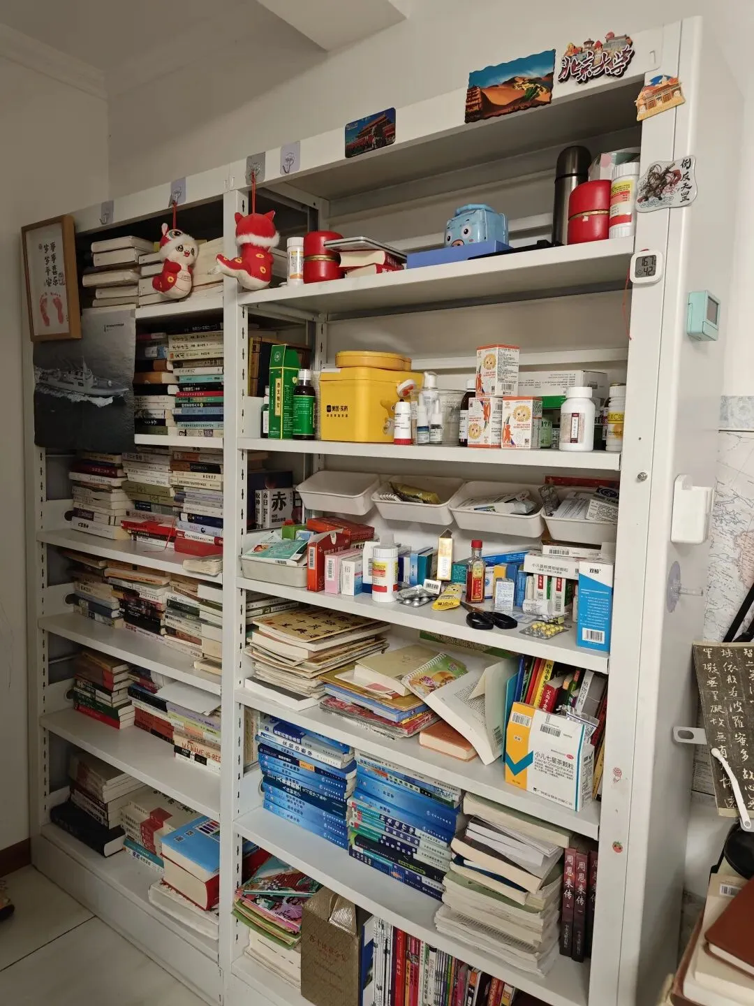 因为是钢制的,可以把冰箱贴贴在上面装饰一下,冰箱的表面是一层玻璃,这些贴完全没用处。就是隔一段时间得清理一下灰尘,为了避免书籍落灰,我是把书横着放的,有些新书的塑料膜也没有拆,直接放上去。