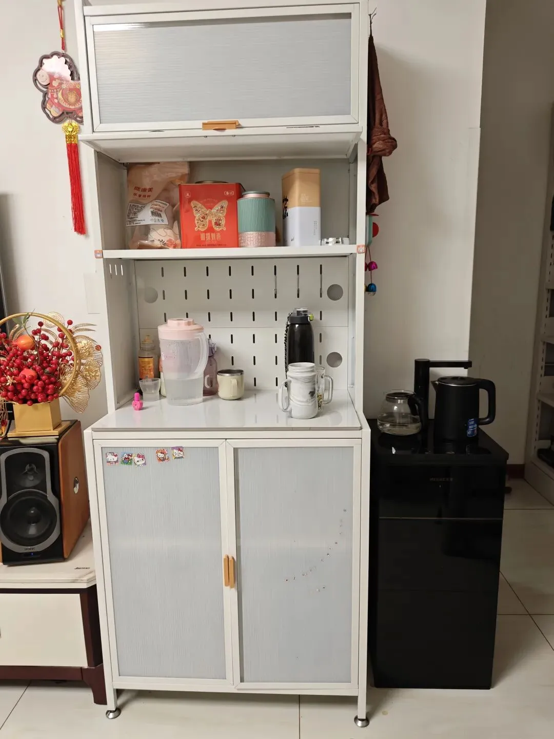 饮水机旁边之前放了一张小桌子,可以放凉水壶、水杯、茶叶等,感觉比较单调,网上搜了搜发现有厨房的餐边柜还不错。买了一个这种L型的,下面的空间比较大,本来是在厨房放大件物品的,可以放水桶等大件。上面的柜子稍微窄一点,放茶叶、杯子,中间还有洞洞板可以挂点东西。台面选择了这种能操作的,其实是可以切菜,不过平时主要是放杯子,材质说是岩板,看起来就像是一块地板砖。