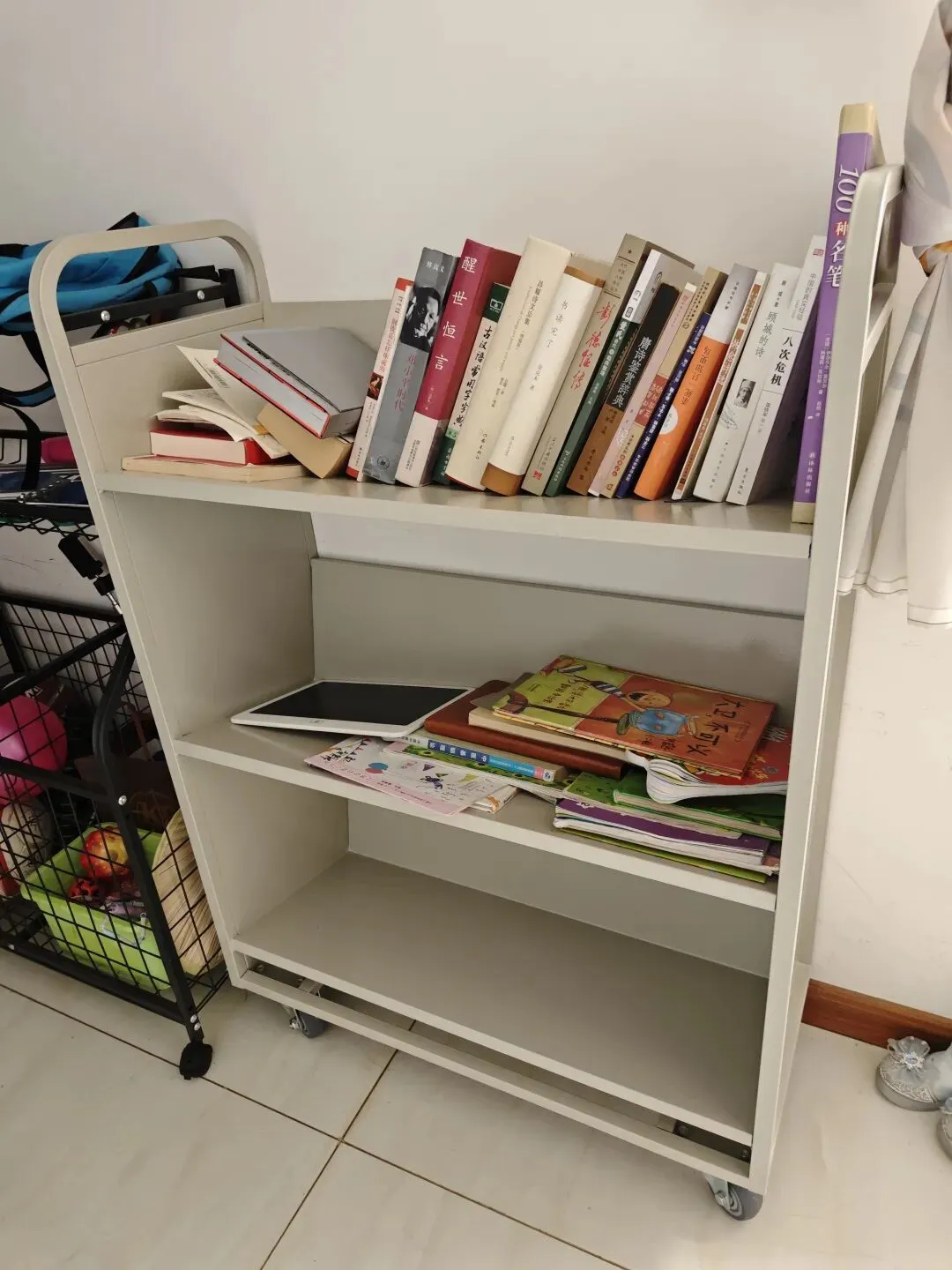 去胖东来转的时候,在它的书店看到一个小书车很好用,回来在网上搜了搜,比选了一番就下单一个。收到货后发现尺寸挺大,比在书店见的尺寸要大的多,书店的可能是两层或者定制的,我买这个是三层,高度多了三十多公分。计划是把平常在读的书,小孩经常看的书集中在一起,可以随时推行,这样避免书桌、床头全摆的是书。