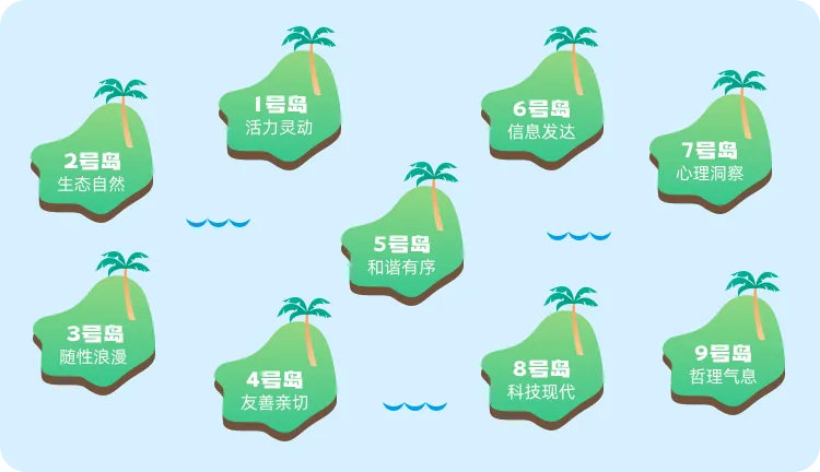 在东边的海域,有九个神奇的小岛。小岛住着不同的居民,你更想和谁成为邻居?