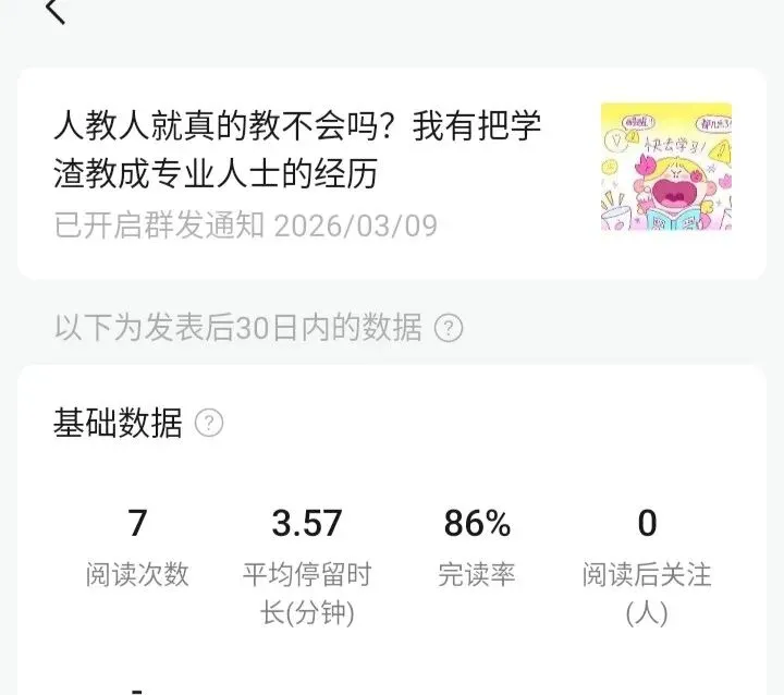 我是一个老牌文科生,也曾做过八年多的网络编辑,很不幸的是:在自媒体发展得最快的那几年我转行去做了教育。我是一个懂教育的文科生,所以我能真实地表达自己的感觉和感受。这也是我文章完读率高的原因,接下来我举例让大家看看我文章的完读率。