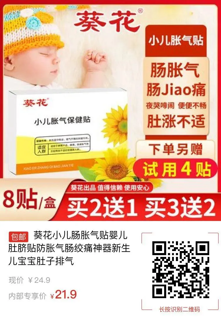 葵花小儿肠胀气贴婴儿肚脐贴防胀气肠绞痛神器新生儿宝宝肚子排气 葵花小儿肠胀气贴婴儿肚脐贴防胀气肠绞痛神器新生儿宝宝肚子排气 价格:24.90元 券后价:21.90元 推荐理由:好货不等人,赶快下单! 扫一扫或识别二维码进入店铺购买! 活动价下单,让您购买更加便宜!享受更多优惠! 活动价商品数量有限,售完即恢复原价,赶快抢购! 关注微信公众号“ 领券商品 ”,更多折扣商品尽在领券商品! 领券商品是专业的优质商品低价折扣平台,每天实时更新全网最优质的最低价的折扣商品(生活用品,零食,饮料,服饰鞋帽,家用电器等)信息。更有天天特价,高额领券,9块9包邮,限时秒杀等特价商品,下单让您享受更多优惠!