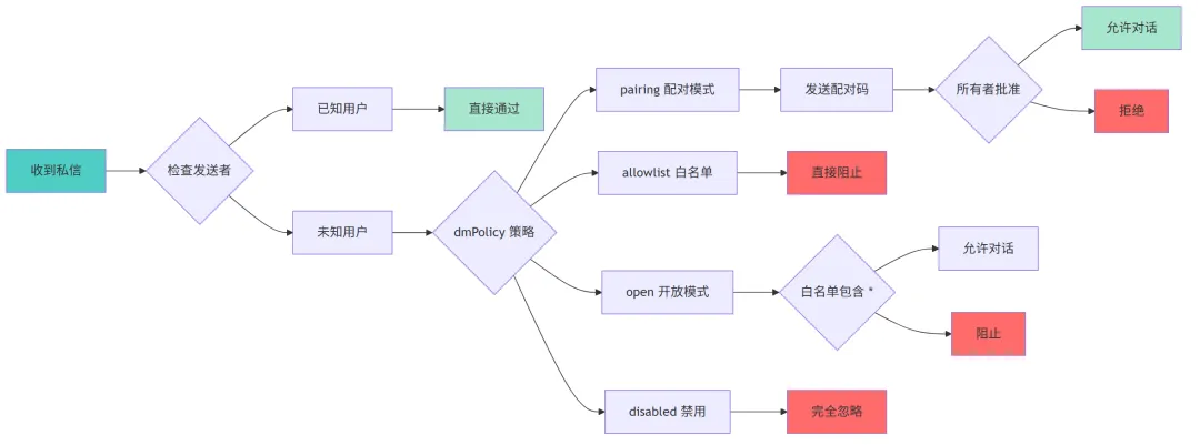 所有支持私信的渠道都支持私信策略(dmPolicy):