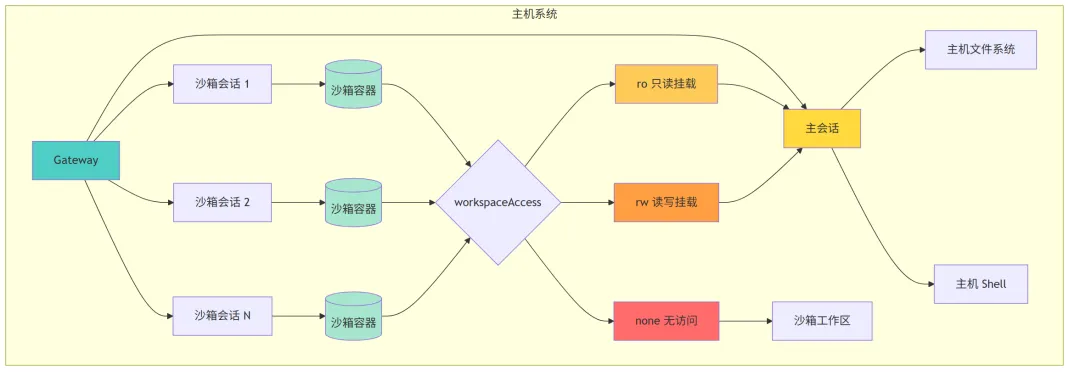 { agents: { defaults: { sandbox: { mode: "all", // off / non-main / all scope: "agent", // session / agent / shared workspaceAccess: "ro" // none / ro / rw } } }}