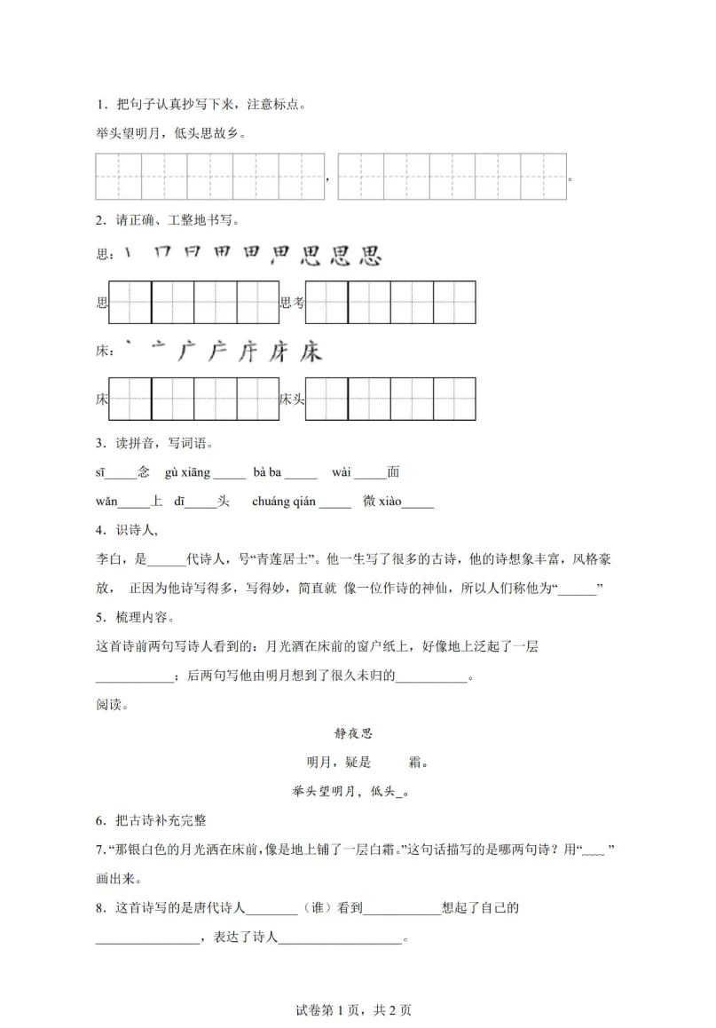 【免费下载】2025-2026学年统编版一年级下册第7课静夜思A卷,可打印