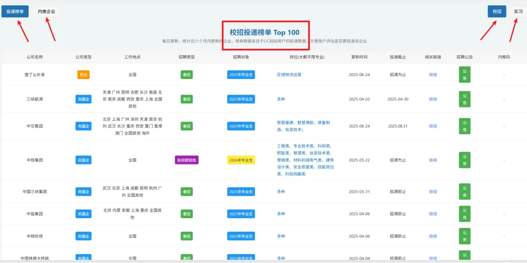为了方便用户投递我们还推出了榜单功能,可以实时看到哪些企业投递人数最多,包括 校招实习