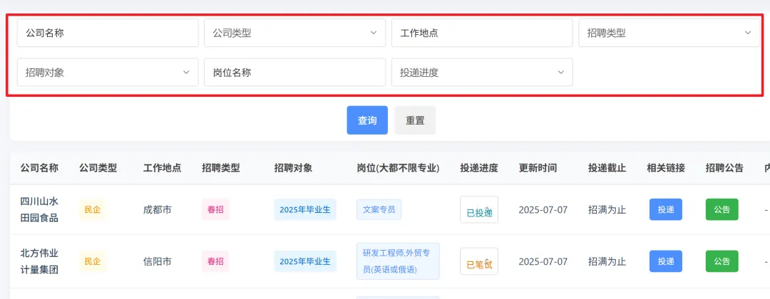 支持自定义筛选公司,目前可以根据 公司类型、招聘类型、投递进度、招聘对象、岗位名称、公司名称、工作地点 等各方面筛选: