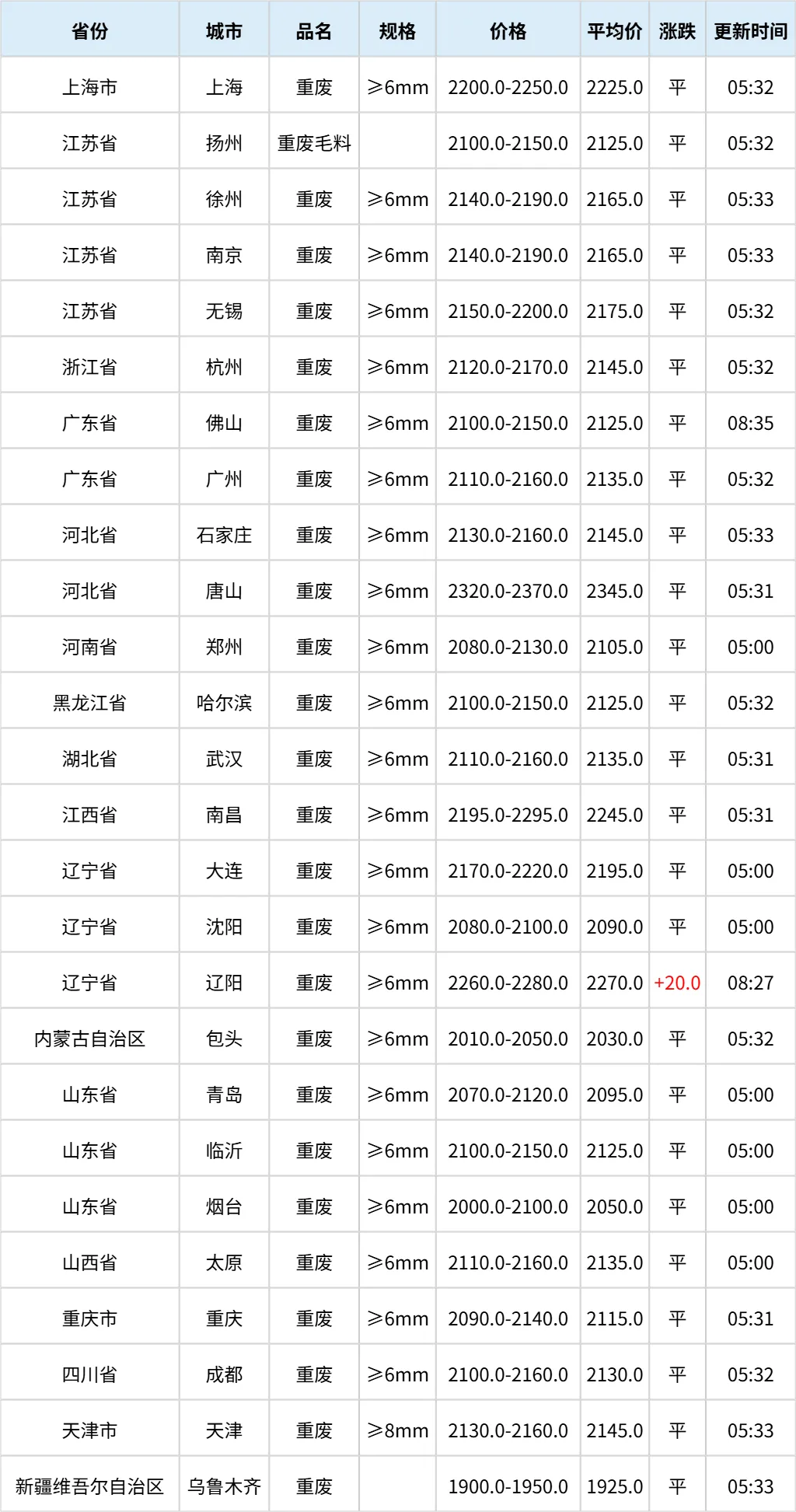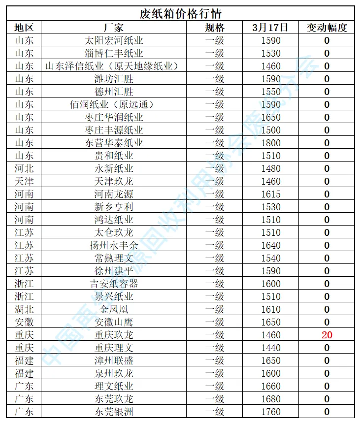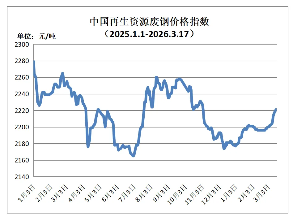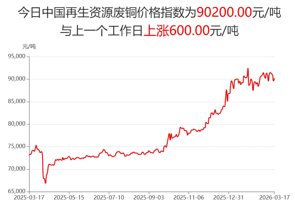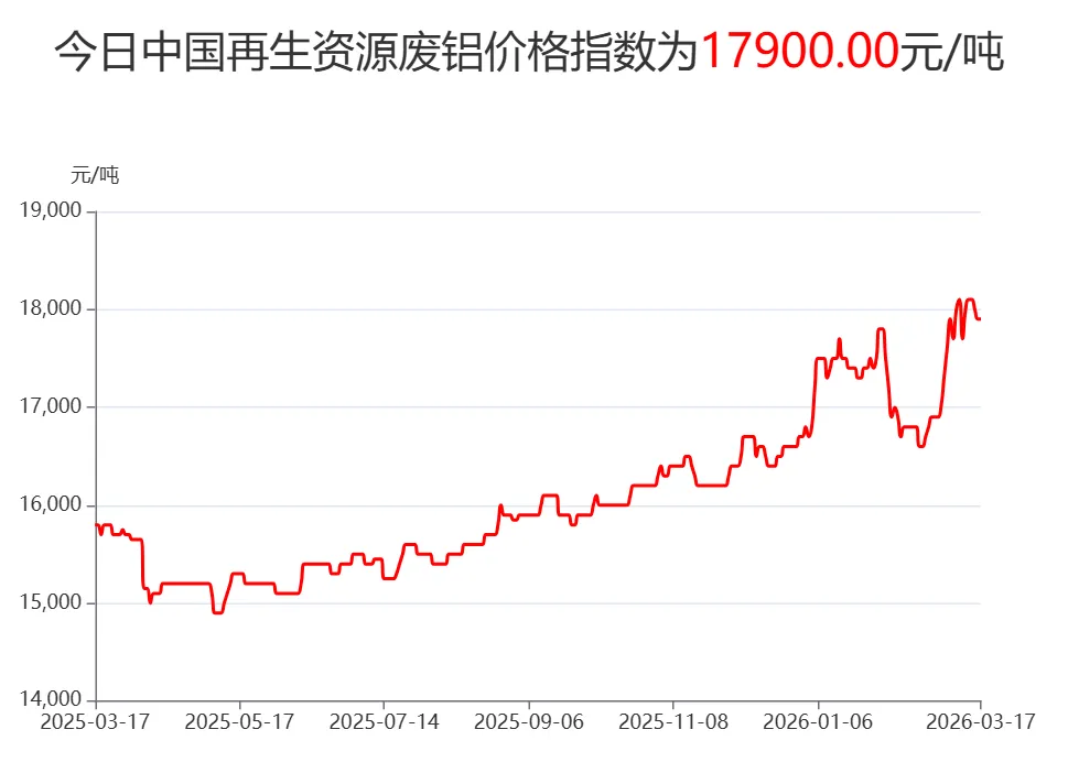 【日报】3月17日再生资源价格指数及日报 PART.001 废钢日报 今日中国再生资源废钢价格指数为2221元/吨,较上一个工作日上涨0.4元/吨,望废钢厂家密切关注价格指数变化,谨慎交易。 3月17日全国各地废钢价格行情一览 PART.002 废纸日报 今日中国再生资源废纸价格指数为1599元/吨,与上一个工作日相比上调1元/吨。望当地废纸商家密切关注价格走势,谨慎操作! PART.003 废铝日报 废铝:今日中国再生资源废铝价格为17900元/吨。望当地废铝商家密切关注价格走势,谨慎操作! 3月17日全国各地废铝价格行情一览 PART.004 废铜日报 废铜:今日中国再生资源废铜价格为90200元/吨。望当地废铜商家密切关注价格走势,谨慎操作! 3月17日全国各地废铜价格行情一览 中国再生资源价格指数说明 为方便相关政府部门、科研机构及国内外再生资源企事业单位更好地了解中国再生资源价格、内外再生资源品种价差,中国再生资源回收利用协会推出中国再生资源价格指数。 目前中国再生资源价格指数已经生成,中国再生资源废钢价格指数、废铜价格指数、废铝价格、废纸指数、废家电指数五大指数。 废钢价格指数说明 指数主要反映发布当天的国内重废(厚度≥6)的废钢铁平均采购价格水平。该指数是以全国主要产钢省的重废采购价为基础,经加权校准,最终产生。 废铜价格指数说明 指数主要反映发布当天的国内光亮线(含量≥99%)的废铜平均采购价格水平。该指数是以全国主要废铜消费省的光亮线采购价为基础,经加权校准,最终产生。 废铝价格指数说明 指数主要反映发布当天的国内机生铝(含量 Fe<2%)的废铝平均采购价格水平。该指数是以全国主要废铝消费省的机生铝采购价为基础,经加权校准,最终产生。 管理单位及发布时间 中国再生资源价格指数由再生资源信息网整理、计算并生成,于每个工作日下午17:00点之前在再生资源信息网微信公众账号上公开发布。
