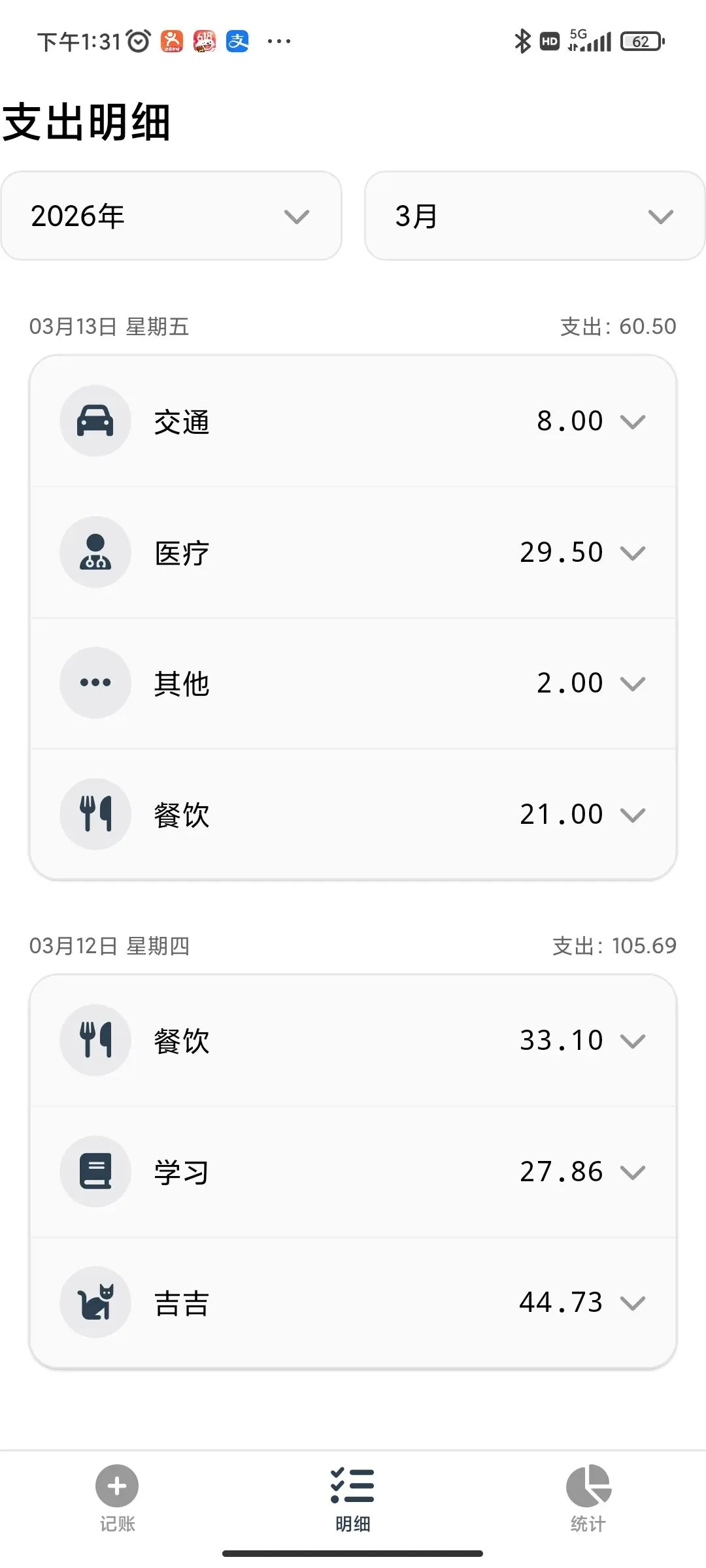 ●支出分类(按我家情况定制):交通、餐饮、服装、房贷、小红(我家车)、学习、医疗、吉吉(我家猫)。