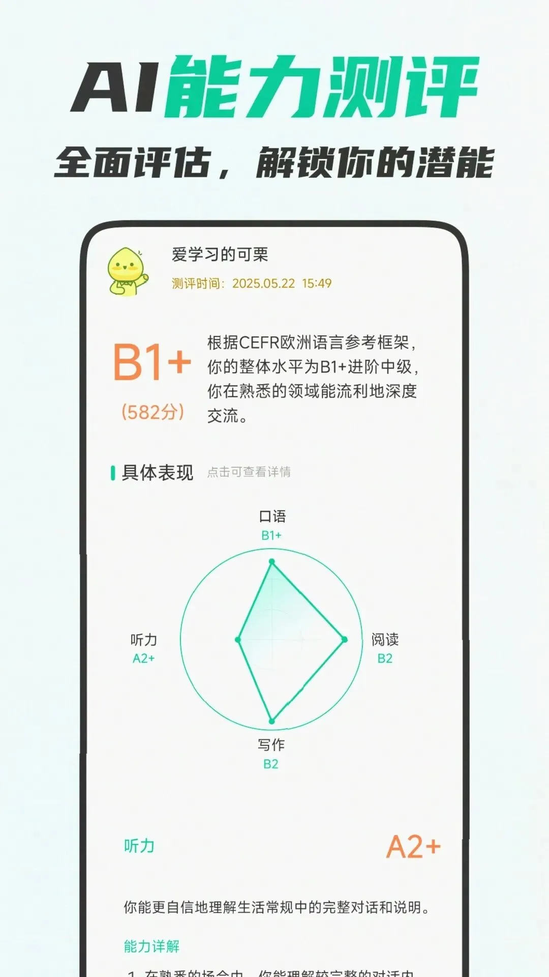 “之前口语一直卡在5.5,找过真人外教也没什么用,可栗的测评报告说我是发音准确度不够,很多重音读错导致扣分,跟着纠正了一个月直接考到6.5,拿到了UCL的offer,真的救大命!”