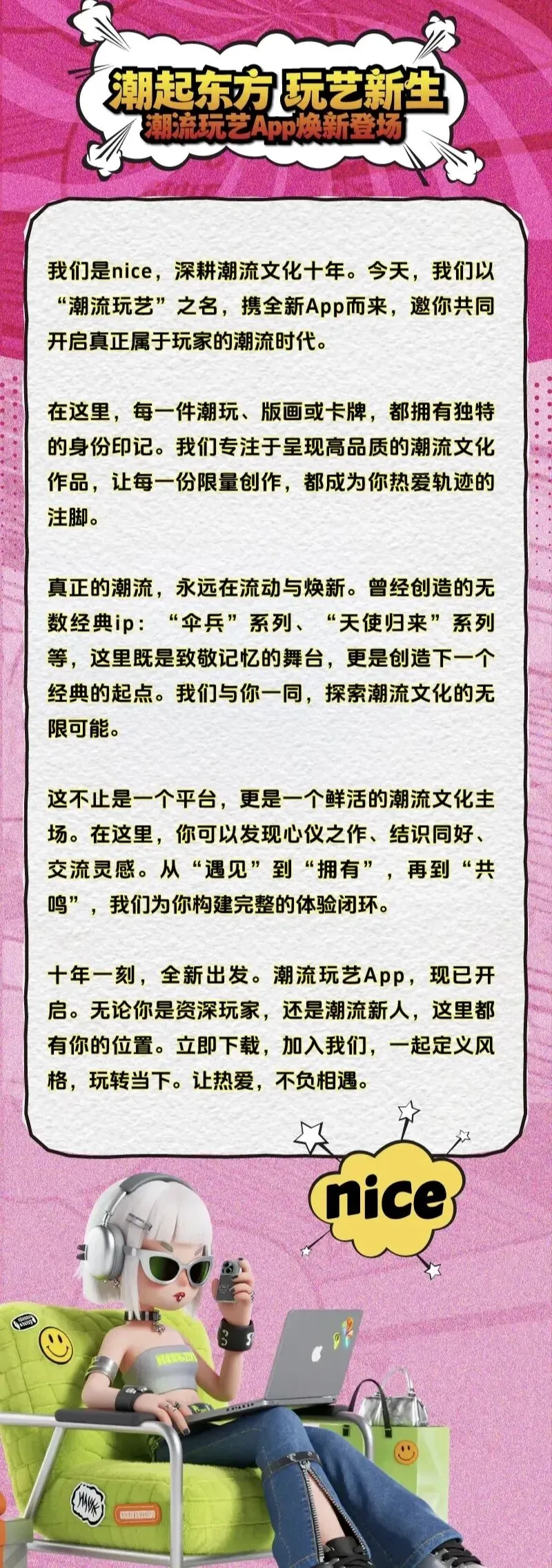 十年一刻,全新出发。 深耕潮流文化十年,nice以“潮流玩艺”之名,携全新App正式登场。这不仅是一次产品的升级,更是一场属于所有玩家的潮流盛宴。在这里,每一件潮玩、版画或卡牌,都拥有独特的身份印记,我们专注于呈现高品质的潮流文化作品,让每一份限量创作,都成为你热爱轨迹的注脚。