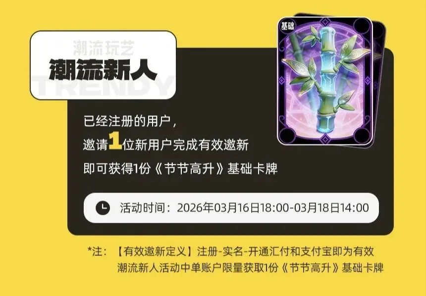 参与方式:已注册用户邀请1位新用户完成有效邀请(注册-实名-开通云支付和支付宝即为有效),即可获得1份《节节高升》基础卡牌,单账号限领1次!
