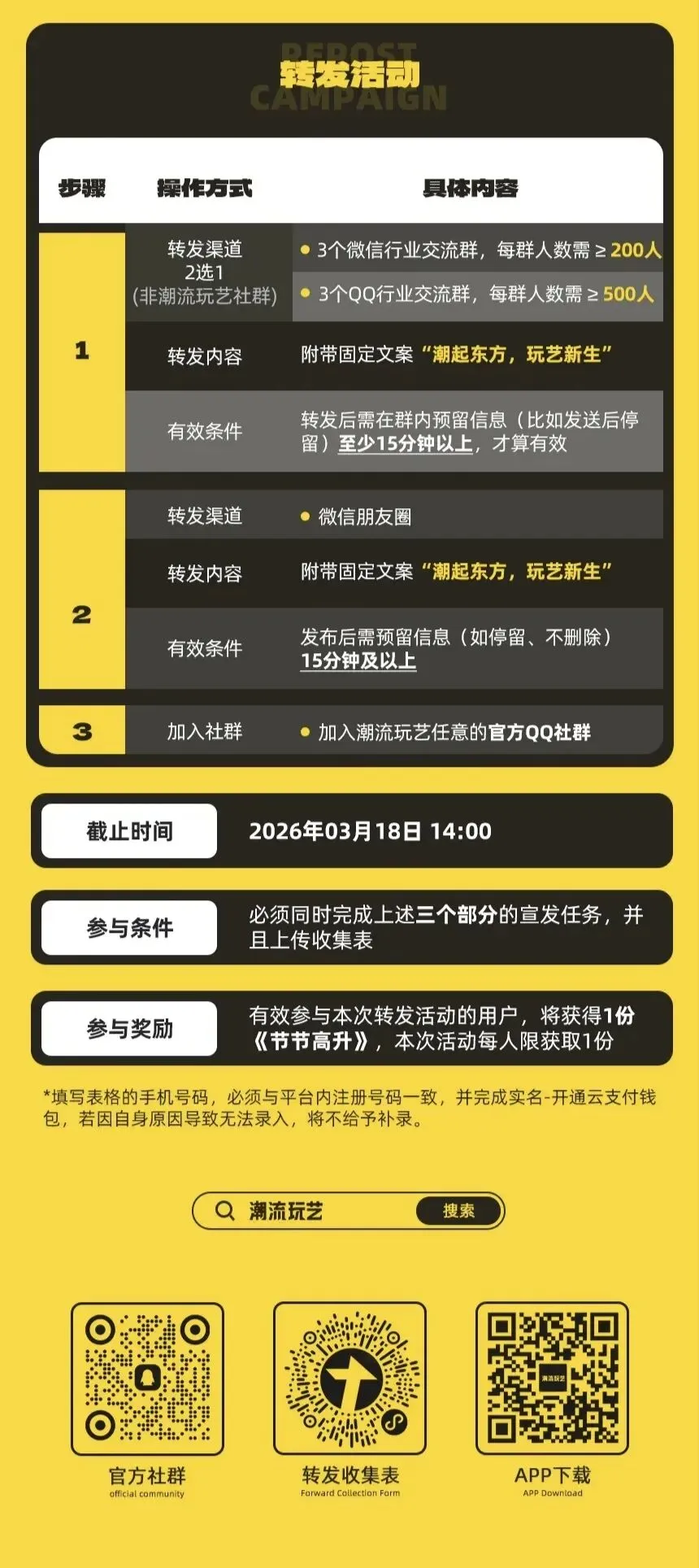 十年深耕,一朝焕新。 潮流玩艺App带着对潮流文化的热爱与初心而来,3月18日11:00向日葵卡盒准时首发,新人福利、转发好礼同步上线,扫描二维码即可下载App、加入官方社群,解锁属于你的潮流收藏与社交主场,让每一份热爱都能在此找到共鸣与回响。