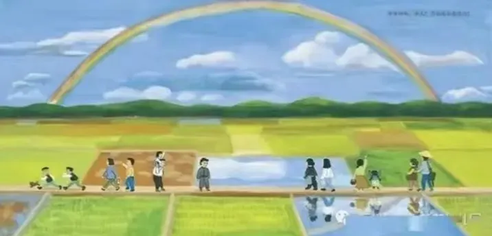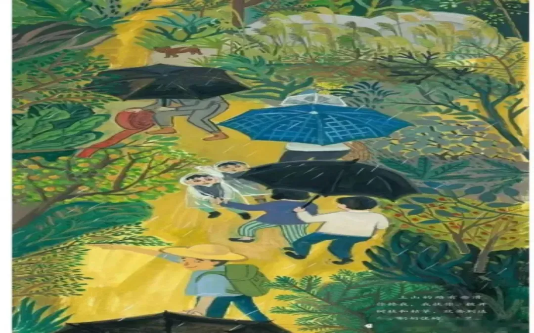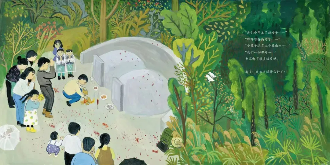 爷爷奶奶、爸爸妈妈、伯父伯母、姑姑、哥哥……田野、小猪崽、大白鹅、三轮车、梅子酒、桂花糕……上山时,雨纷纷,一家人,你搀我,我扶你……扫墓时响鞭炮、对爷爷奶奶说的那些话……下山后,伴着一道明亮的彩虹和爷爷奶奶说再见……