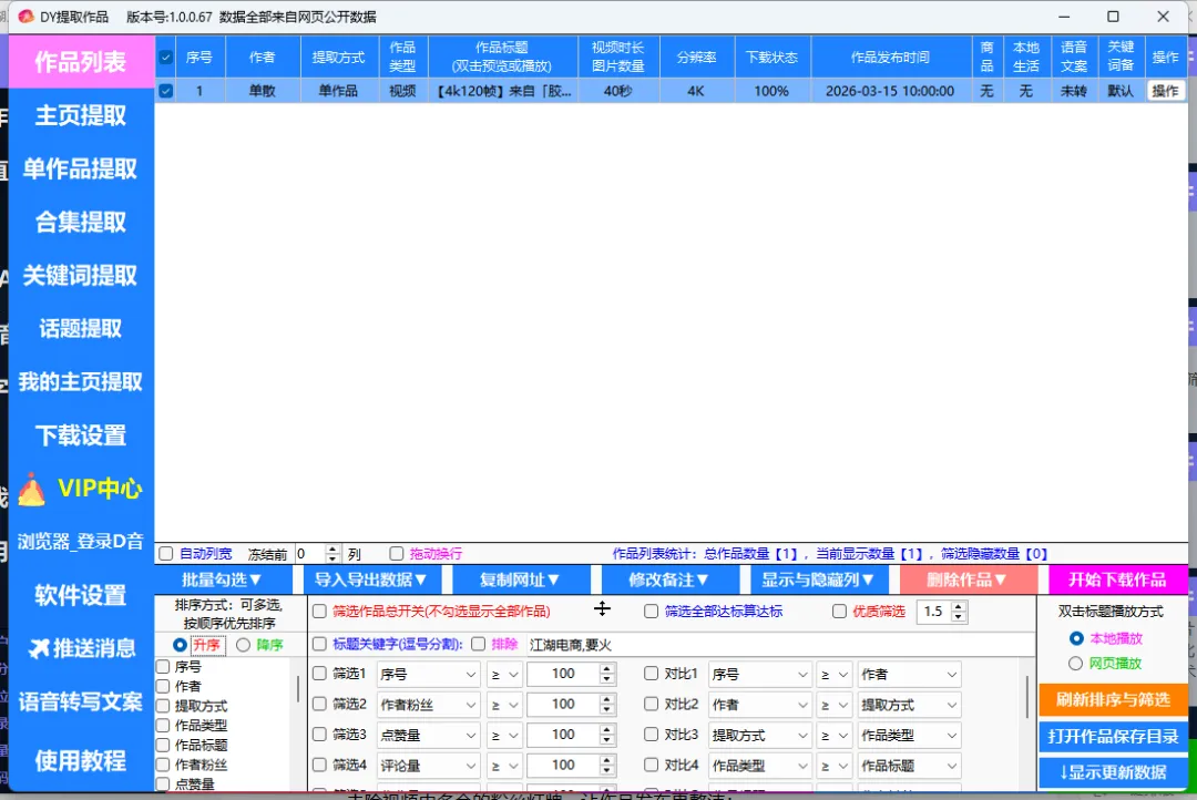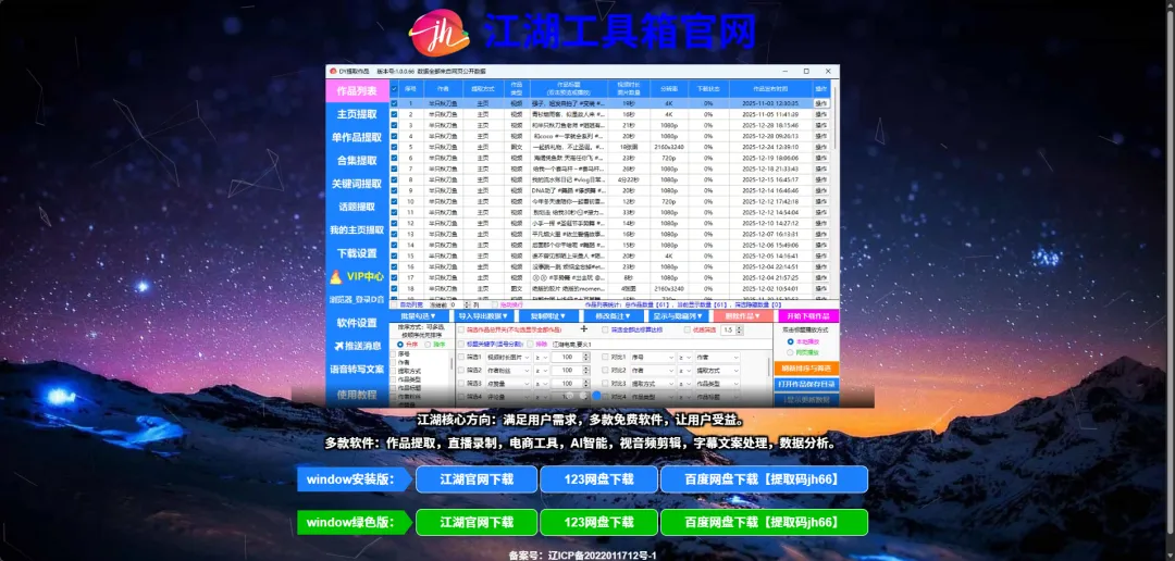 这是江湖工具箱最受好评的功能,完美解决自媒体人素材采集的痛点。支持主页批量提取、单作品解析、合集下载、关键词 / 话题提取等多种方式,不管是自己的作品备份,还是对标账号的素材参考,都能一键搞定。提取的作品会自动去除水印,保留 4K/1080P 等原始画质,还能单独提取视频原声和背景音乐,轻松获取热门 BGM 用于二次创作。更贴心的是,工具支持筛选作品时长、分辨率、点赞量等,精准找到优质素材,大大提升采集效率。