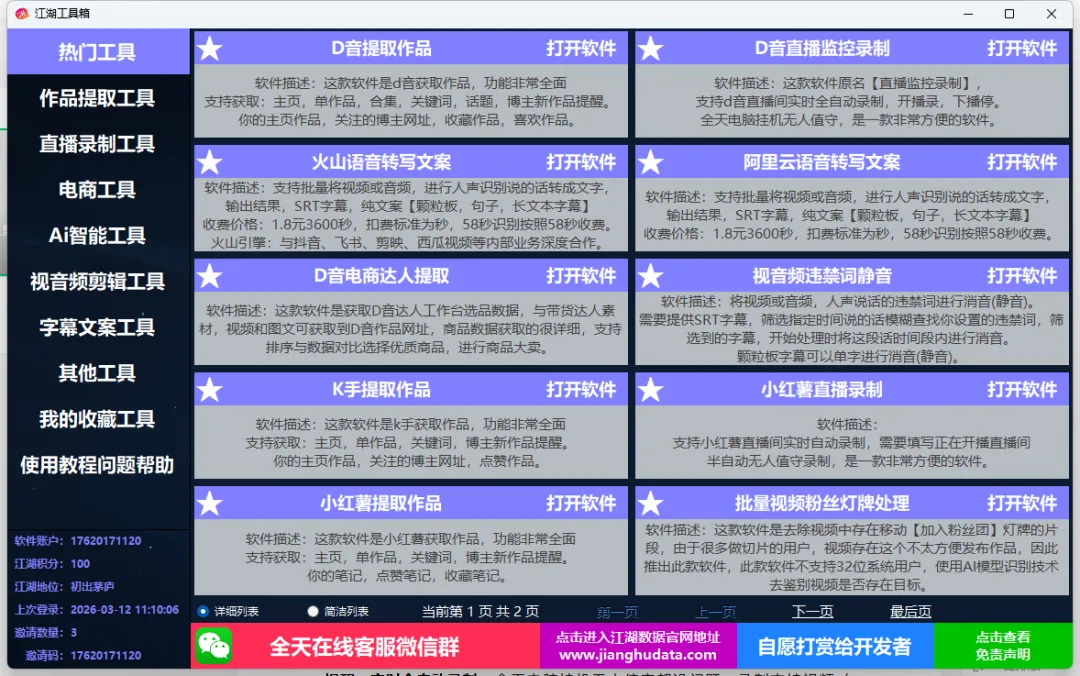 江湖工具箱并非单一功能工具,而是集结了作品提取、直播录制、电商工具、AI 智能、视音频剪辑、字幕文案、数据分析等七大核心模块的综合工具箱,深度适配抖音、快手、小红书、B 站等主流平台,从素材获取到内容优化,一站式搞定。